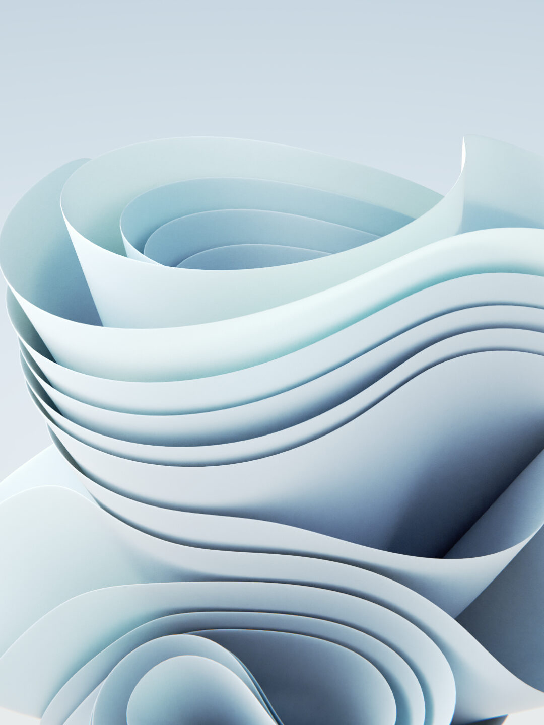 Pale cerulean sheets curl and overlap like peeled paper caught mid-motion against a clean white-to-blue gradient. Smooth shading and soft curves keep the whole composition calm and effortlessly modern.