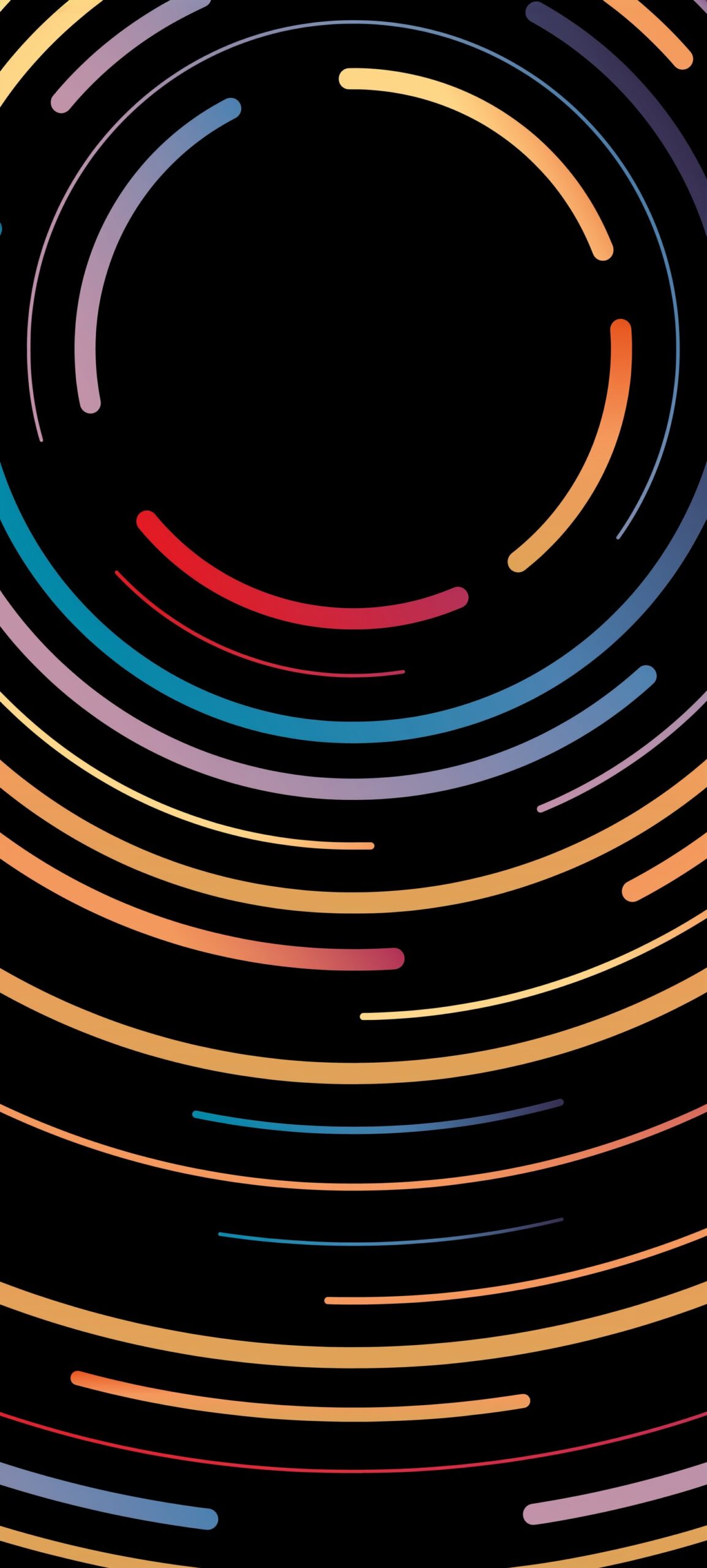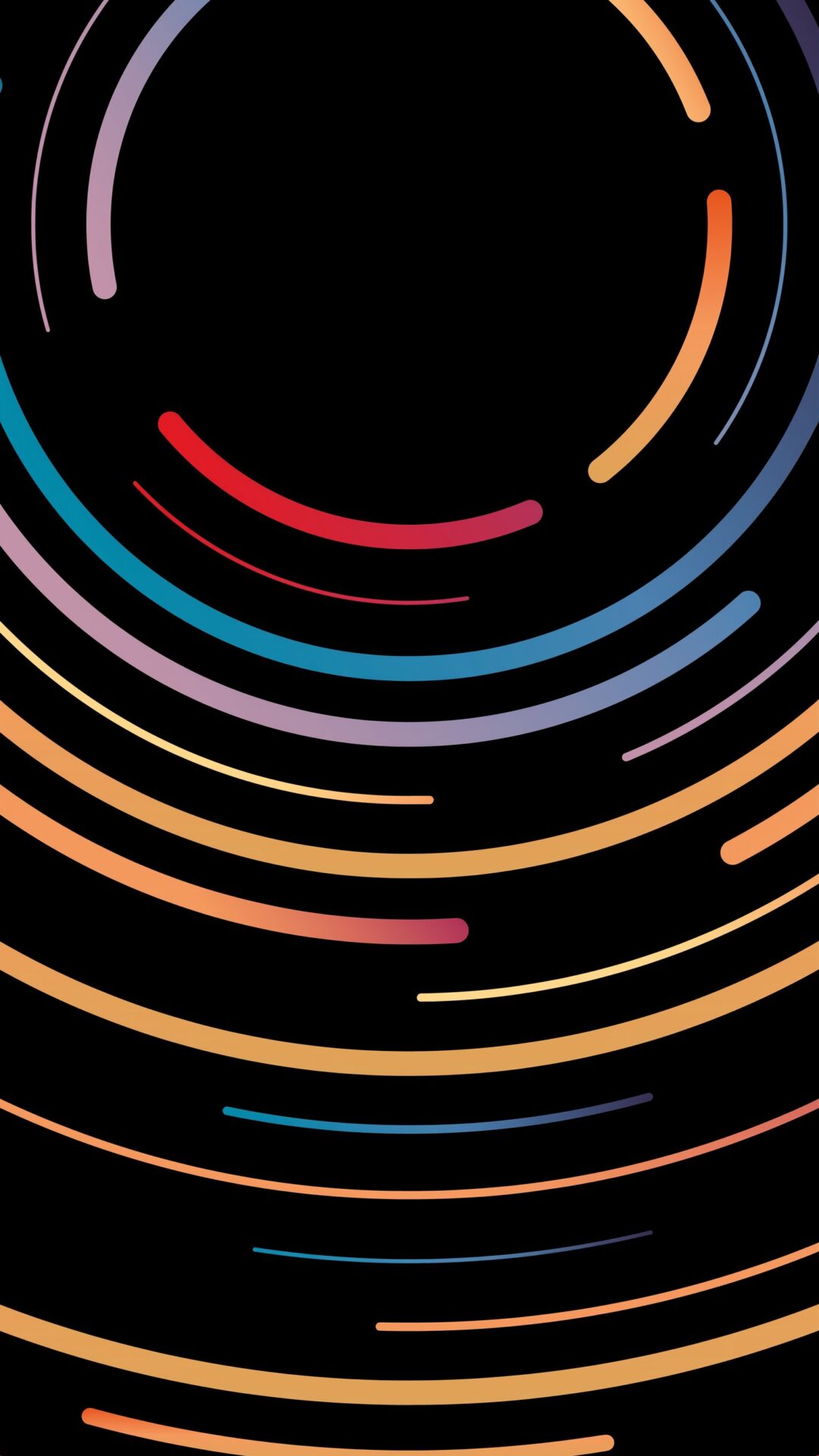 Concentric colored lines radiate from a central point against a black field. Varying line lengths and a spectrum of colors create a sense of…