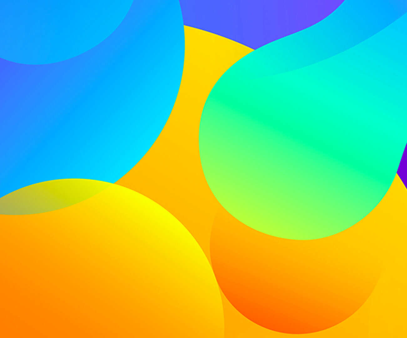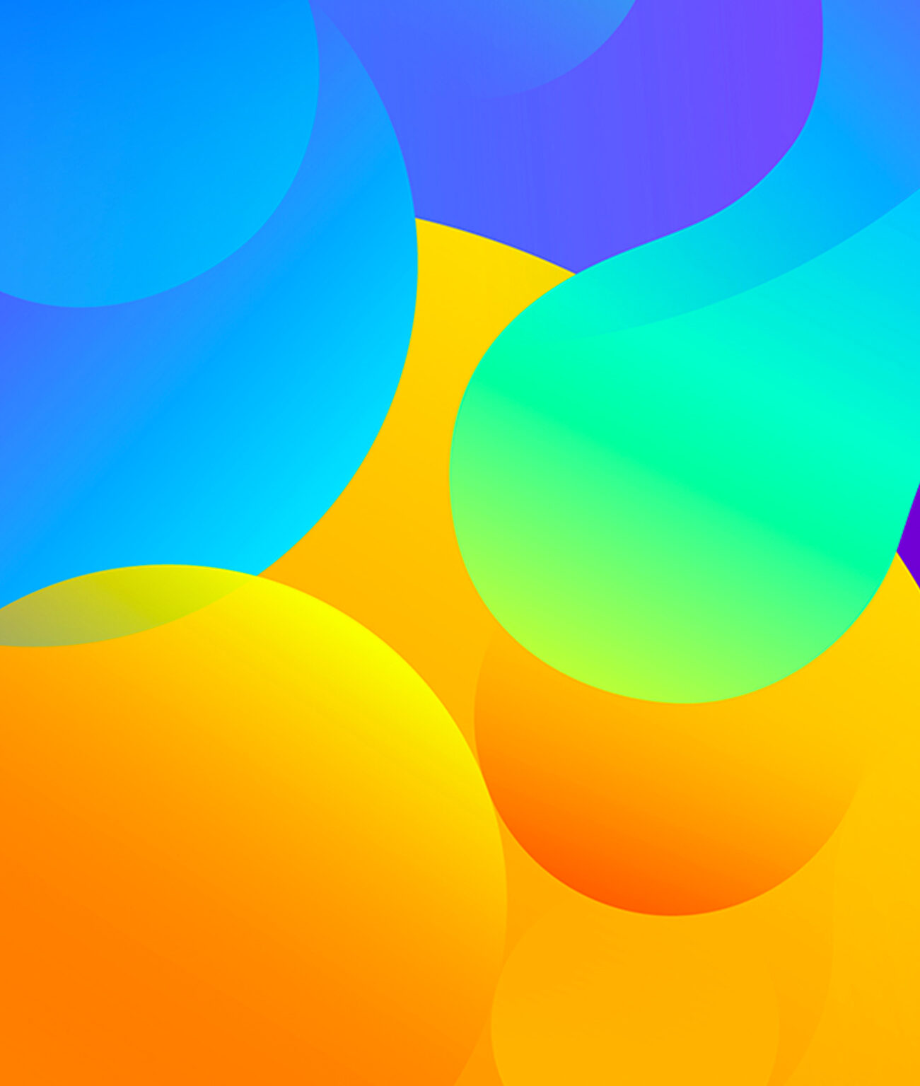 Overlapping circular forms fill the frame with a smooth, flowing composition. The gradients blend from orange and yellow to blue and purple,…