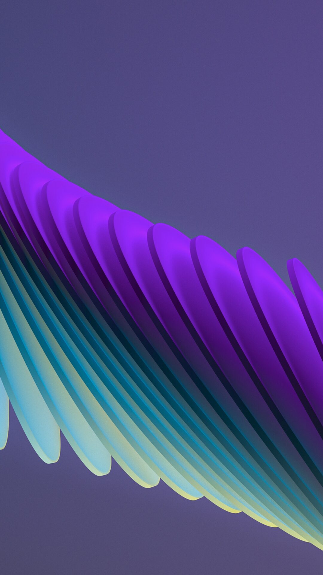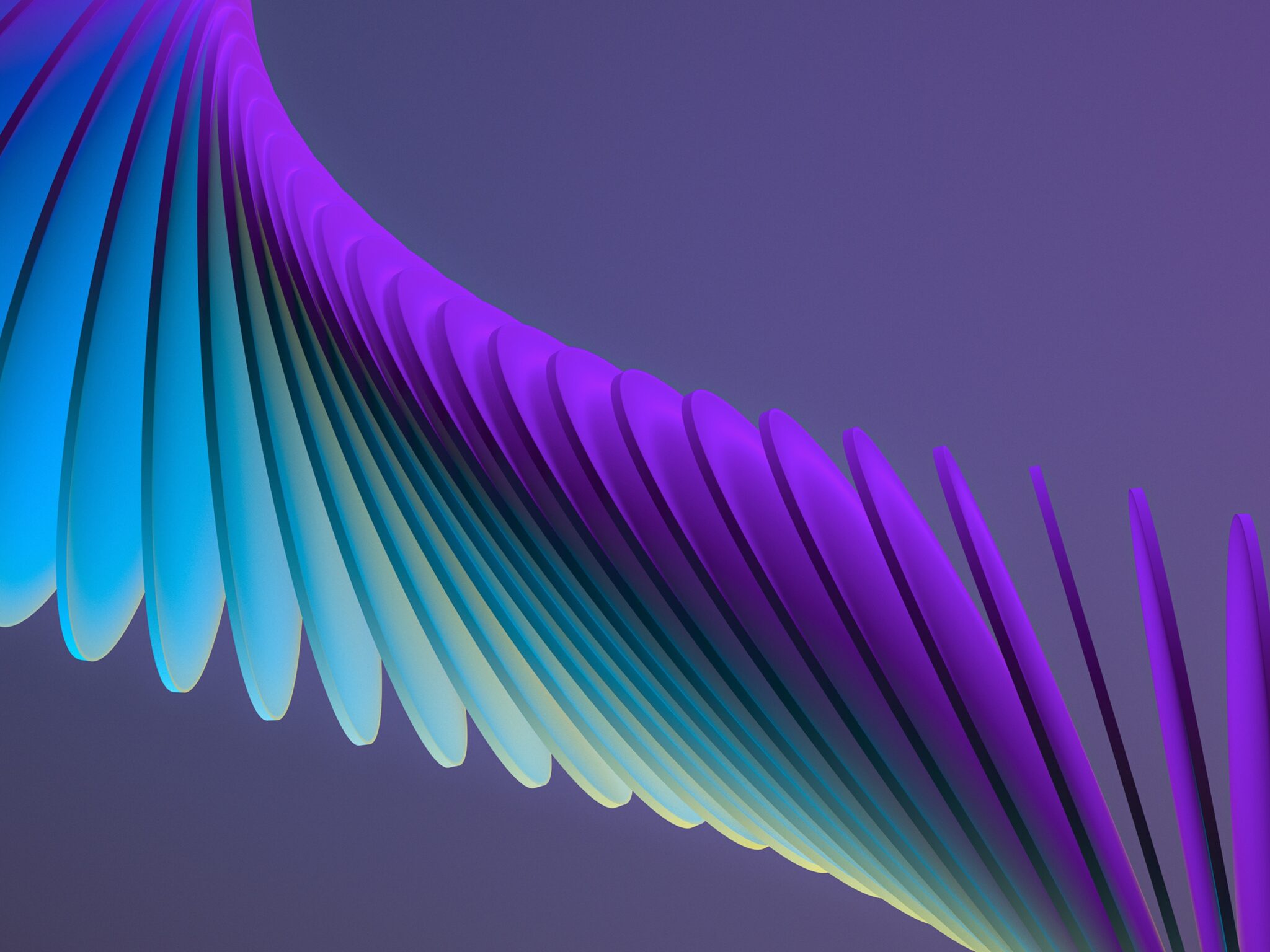 A curving structure with repeating fins fills the frame against a dark background. The color transitions from bright teal to deep purple, with soft shadows accentuating the forms.