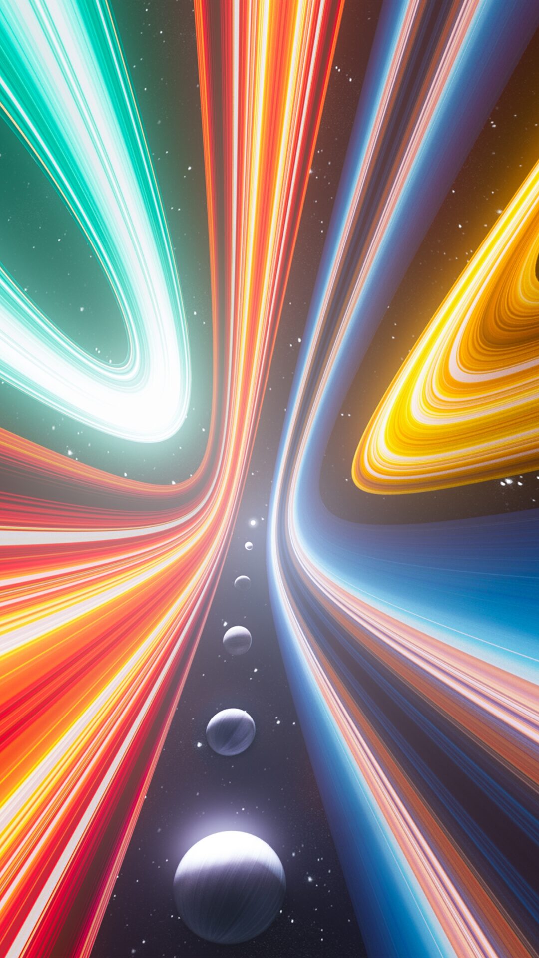 Bright, colorful rings converge towards a vanishing point with several spherical shapes in the foreground. The streaks of light have a soft …
