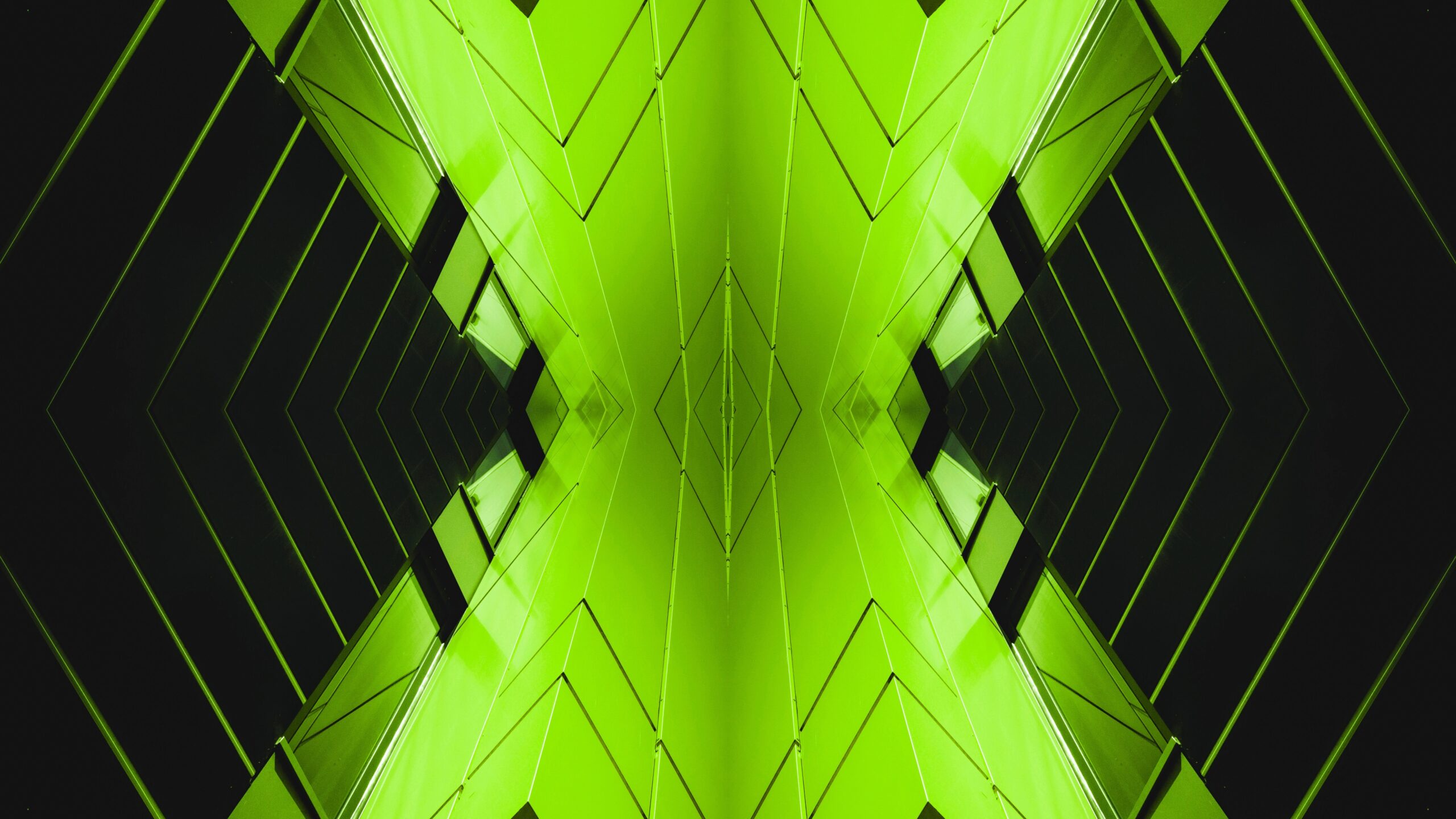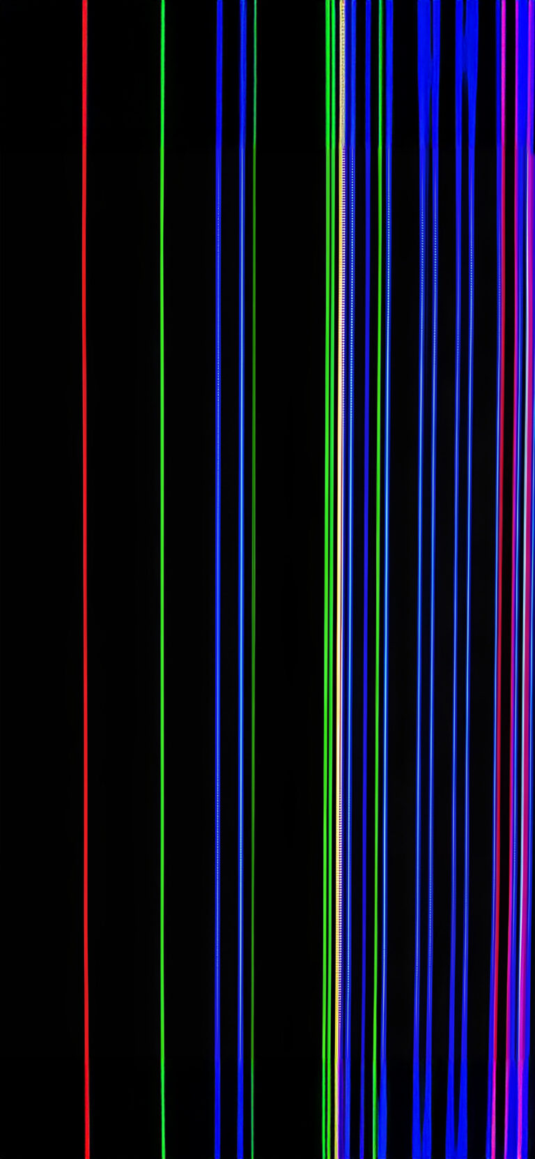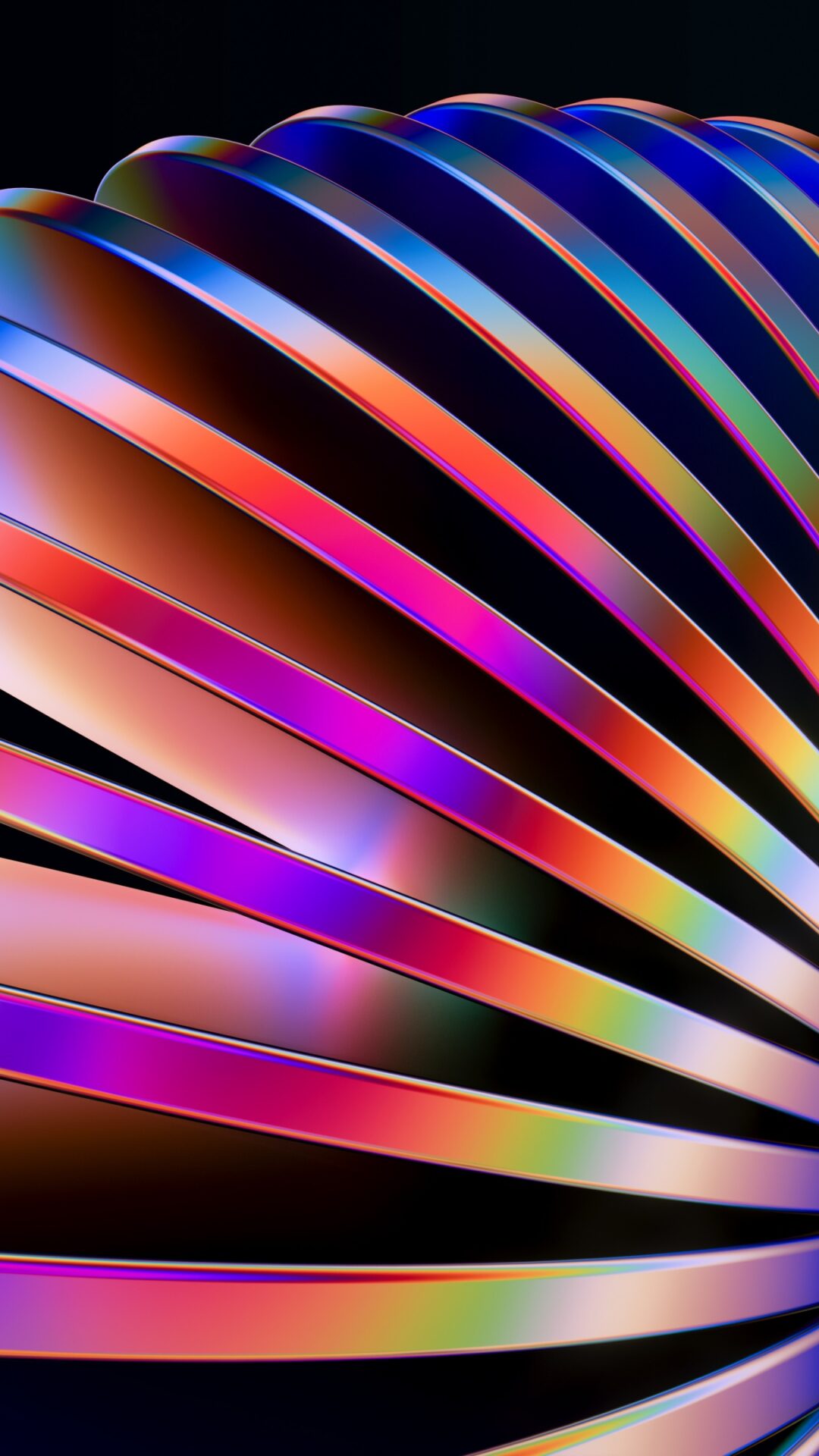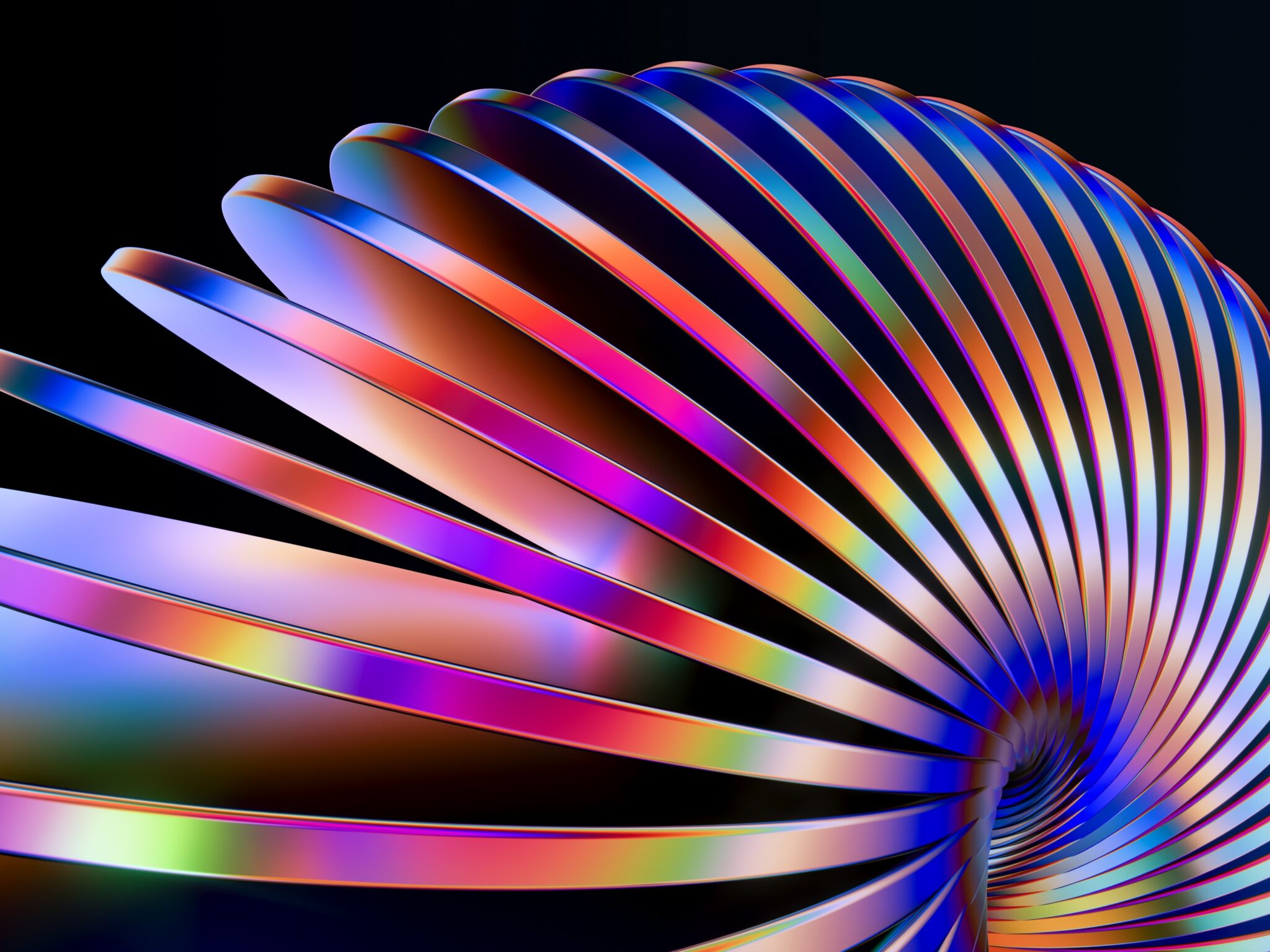 A tightly coiled, abstract form fills the frame against a dark background. Shifting bands of blue, pink, orange, and green create a metallic…
