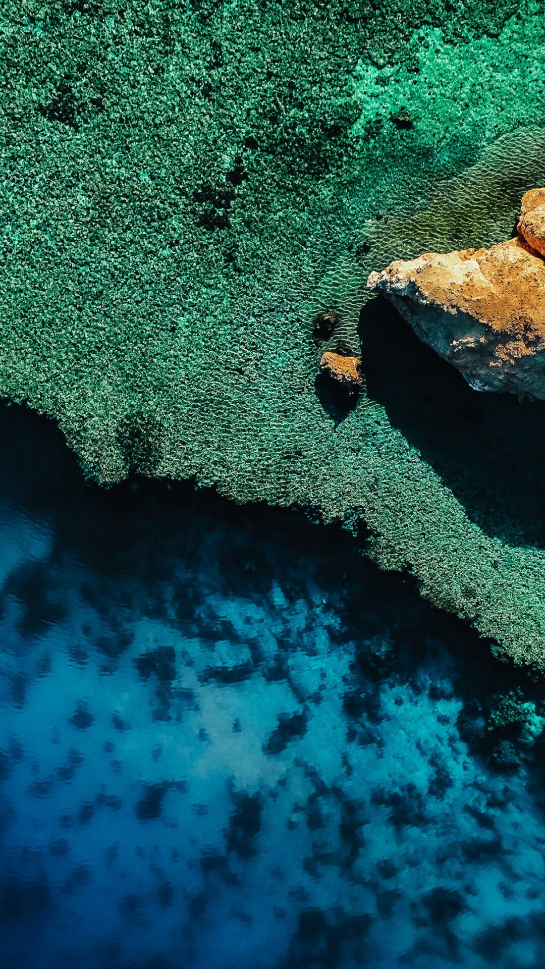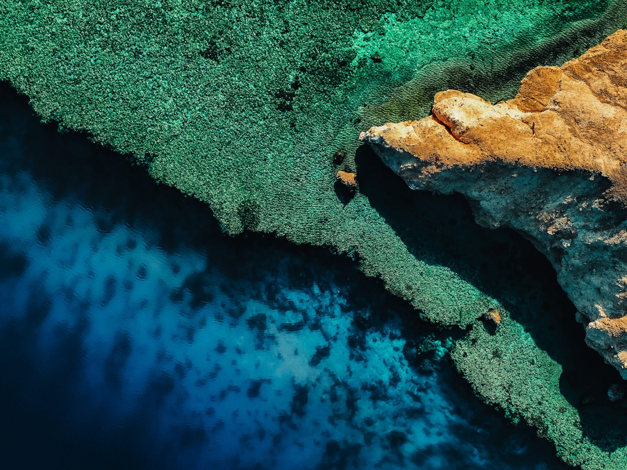 Aerial view captures vibrant coral reefs in crystal-clear turquoise waters meeting golden rocky cliffs along a pristine coastline. Works bea…