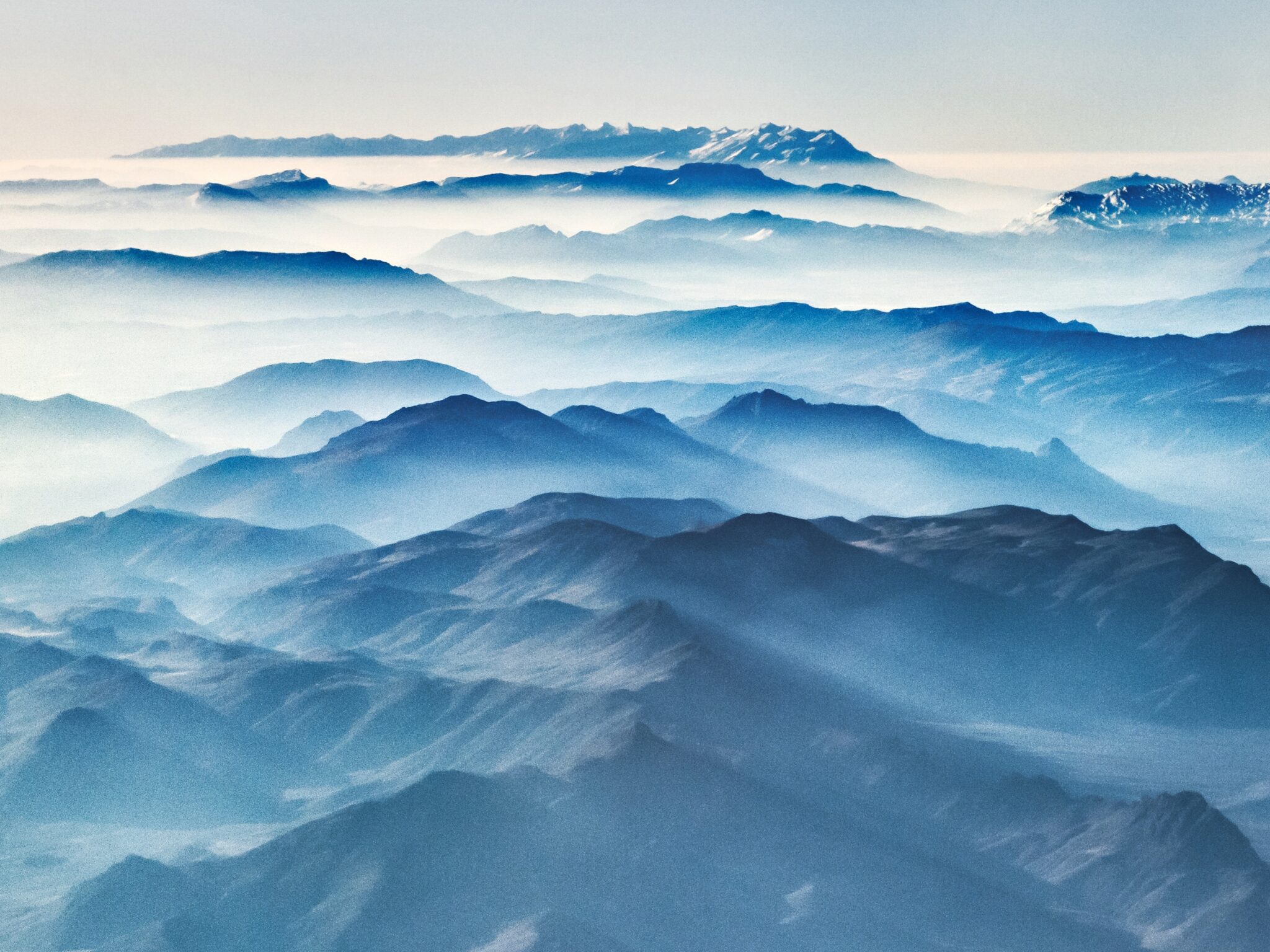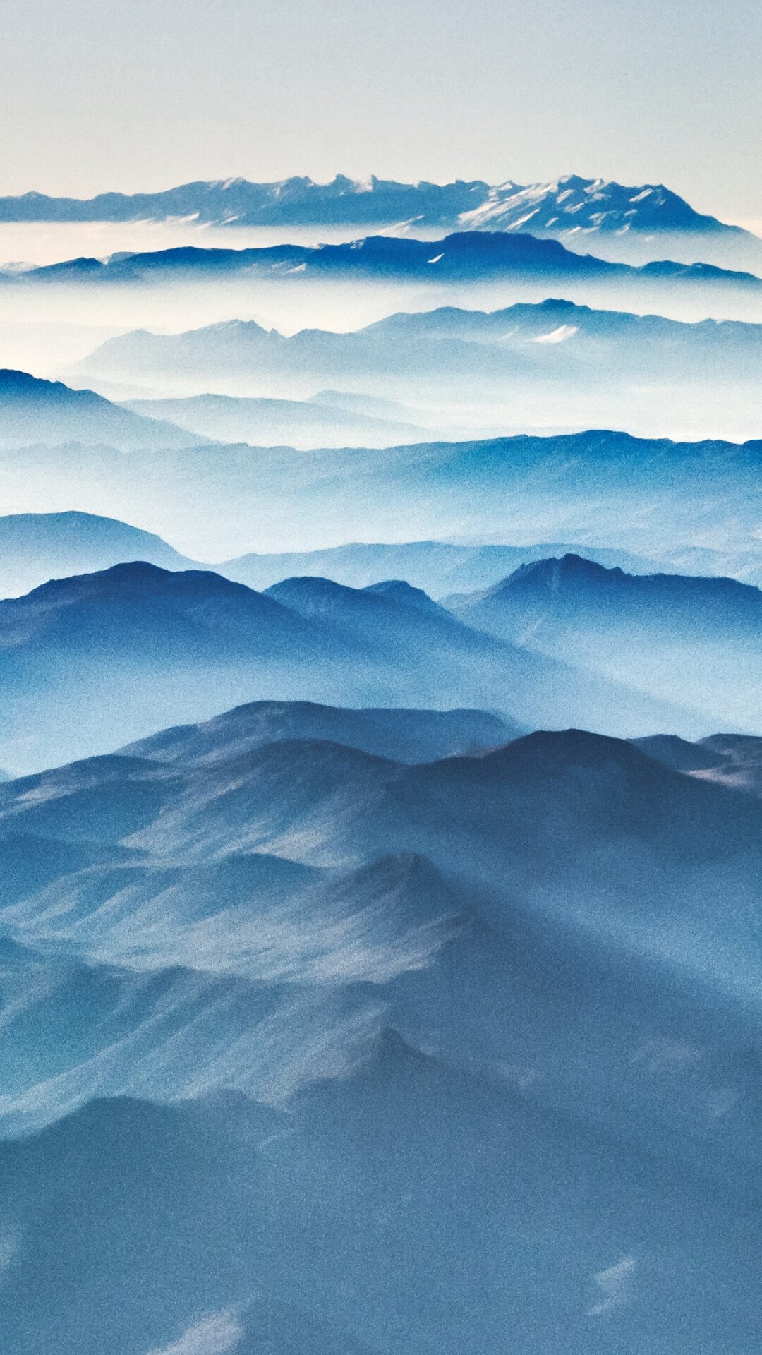 Multiple mountain ranges fade into soft blue and gray tones through layers of misty fog, with snow-capped peaks visible in the distance. Wor…