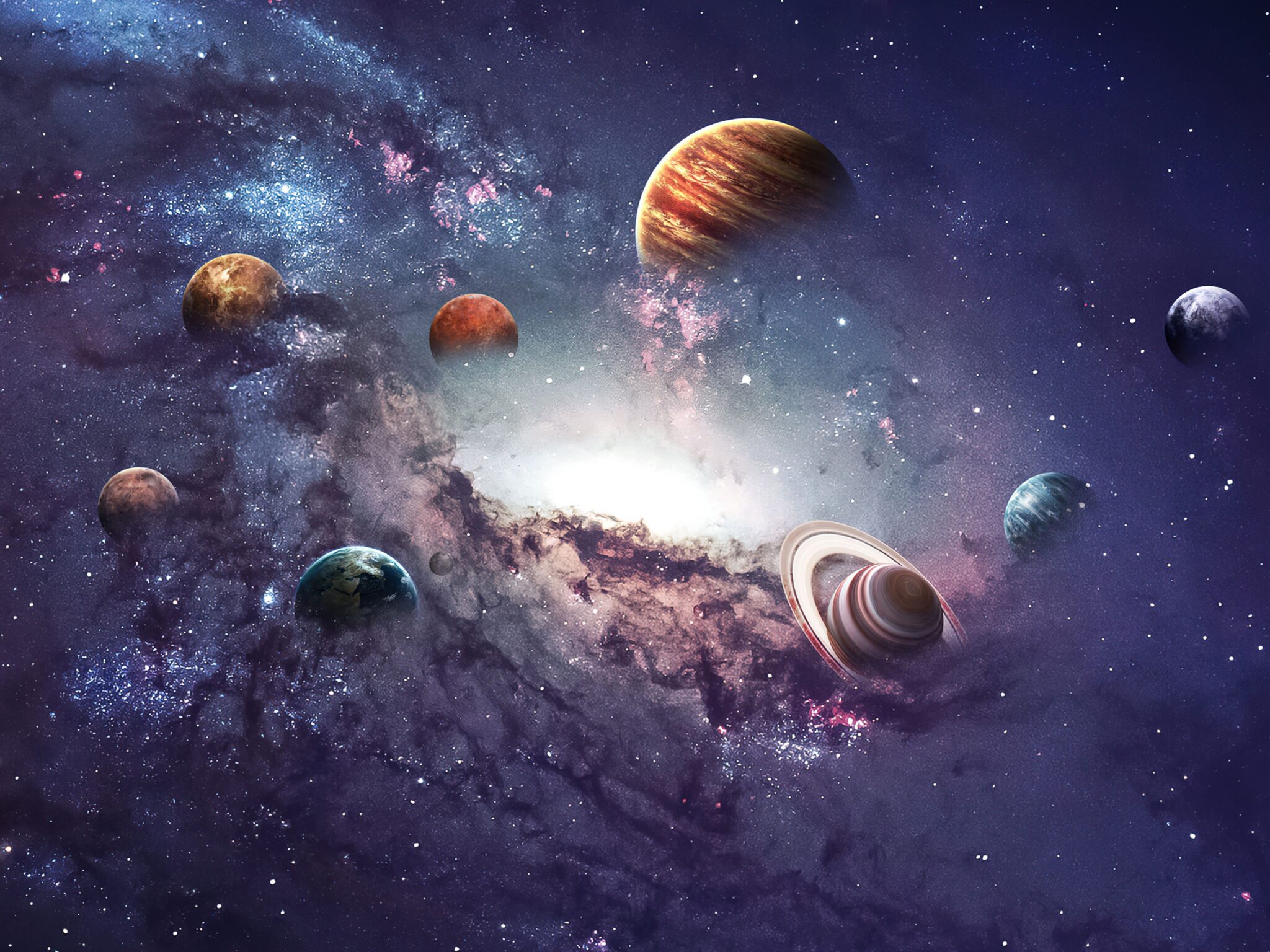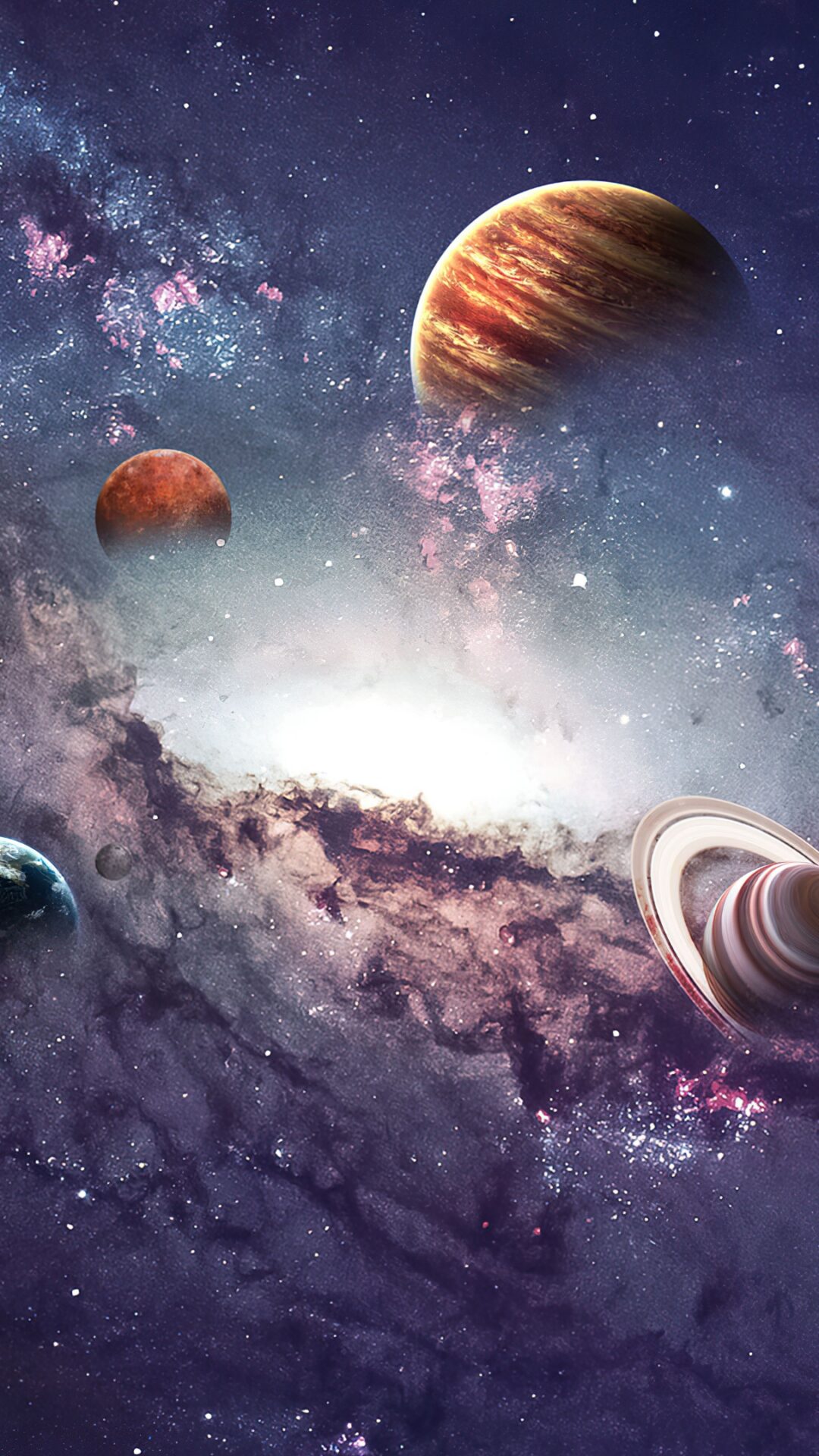 Various planets float around a bright galactic center with swirling purple, blue, and pink cosmic dust creating a dreamy space scene. This w…