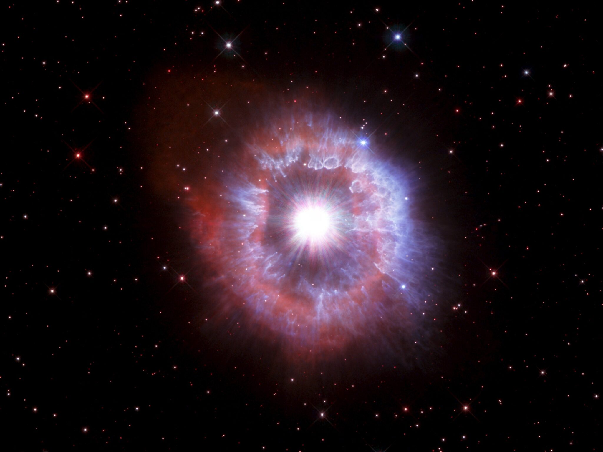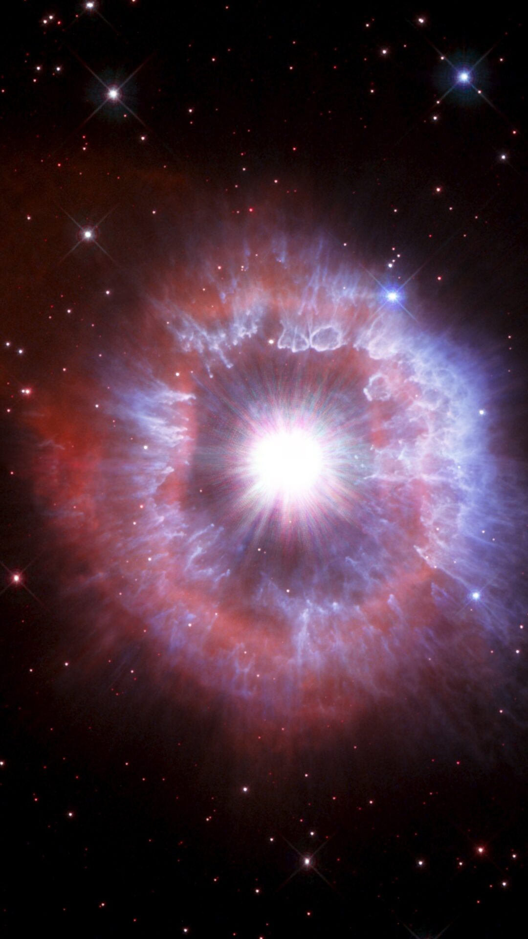 Hubble's telescope reveals AG Carinae's explosive stellar outburst with brilliant white center surrounded by intricate red and blue gas clou