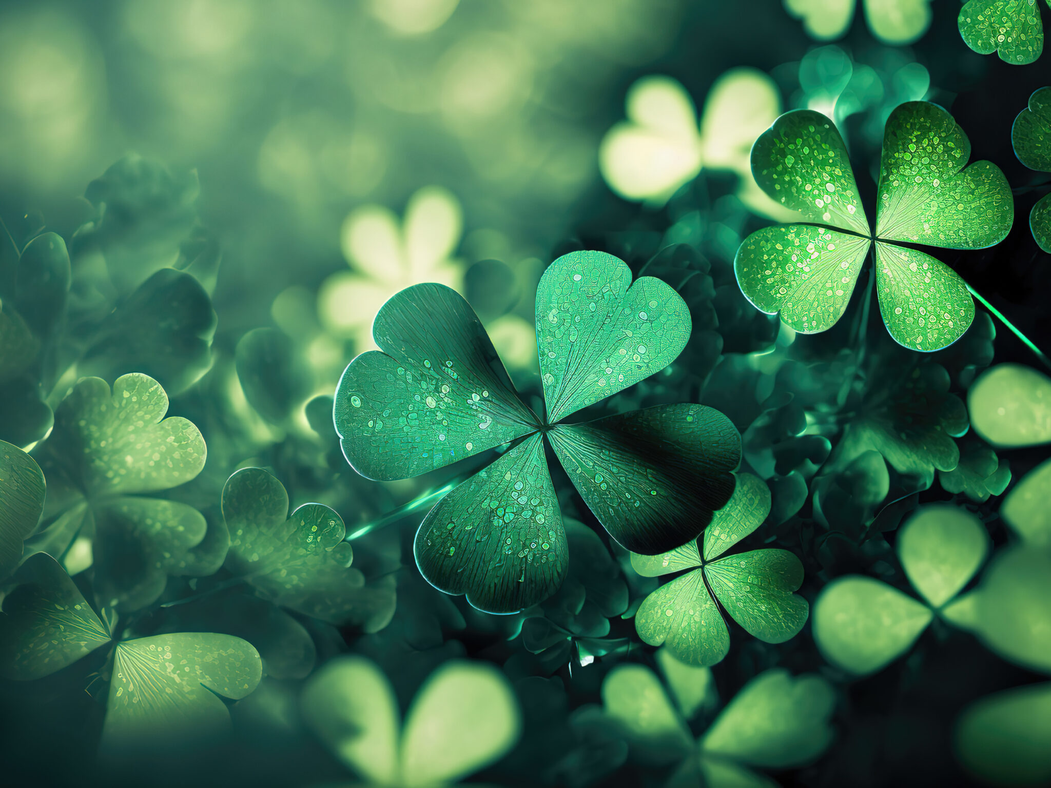 Lush four-leaf clovers glow in vibrant emerald and forest green tones with delicate water droplets catching the light. This AI-generated nature wallpaper works beautifully for 4K desktop monitors and wide-screen displays.