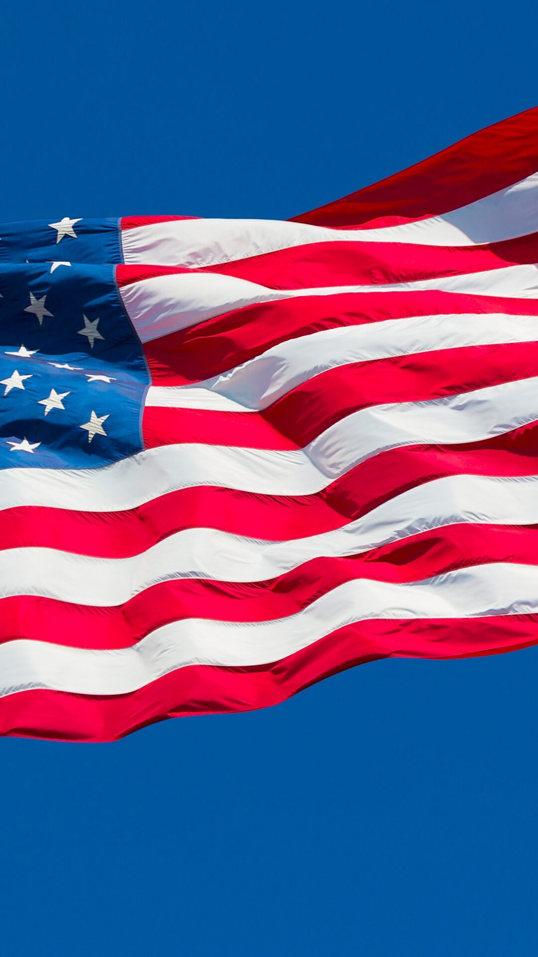 The United States flag is displayed waving in the wind against a clear blue sky. Sunlight creates sharp contrast between the red and white s…