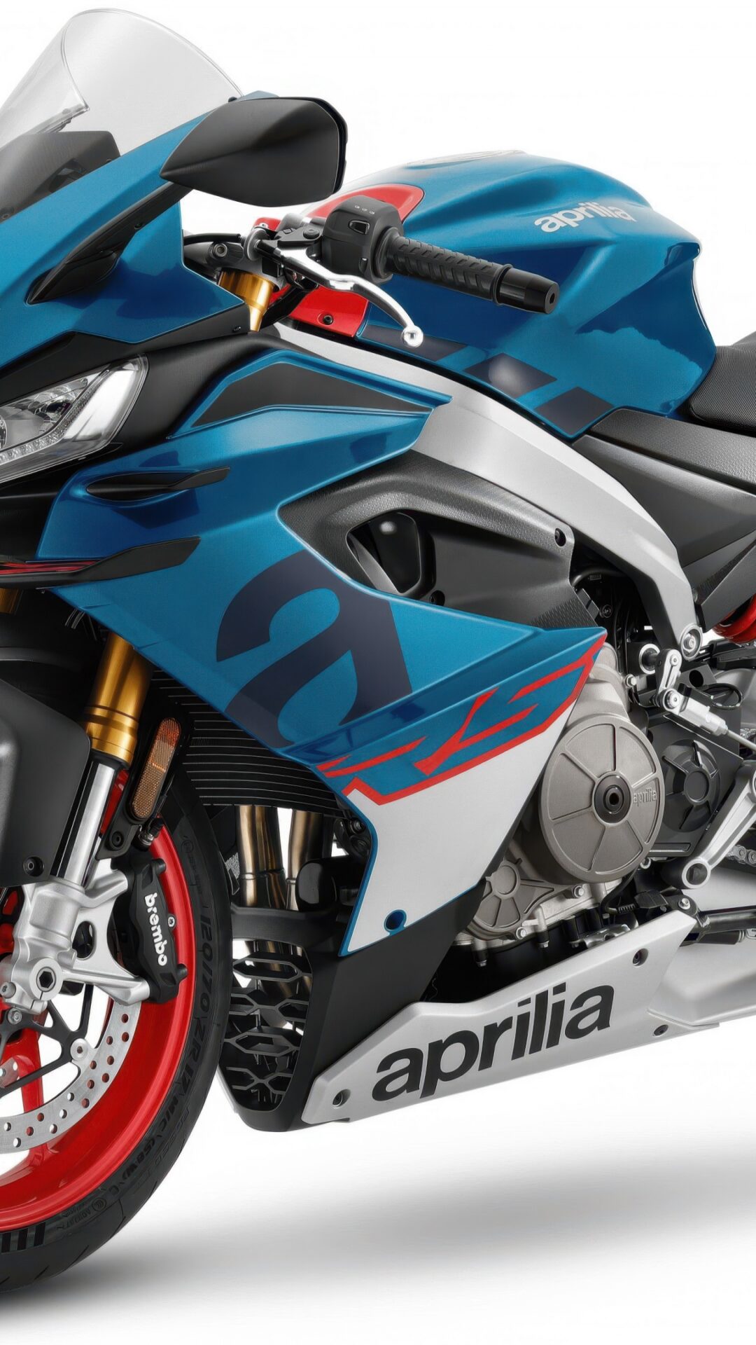 A blue and silver Aprilia RS 660 sport bike is angled against a white background. The metallic silver engine and red wheel accents stand out against the darker bodywork.
