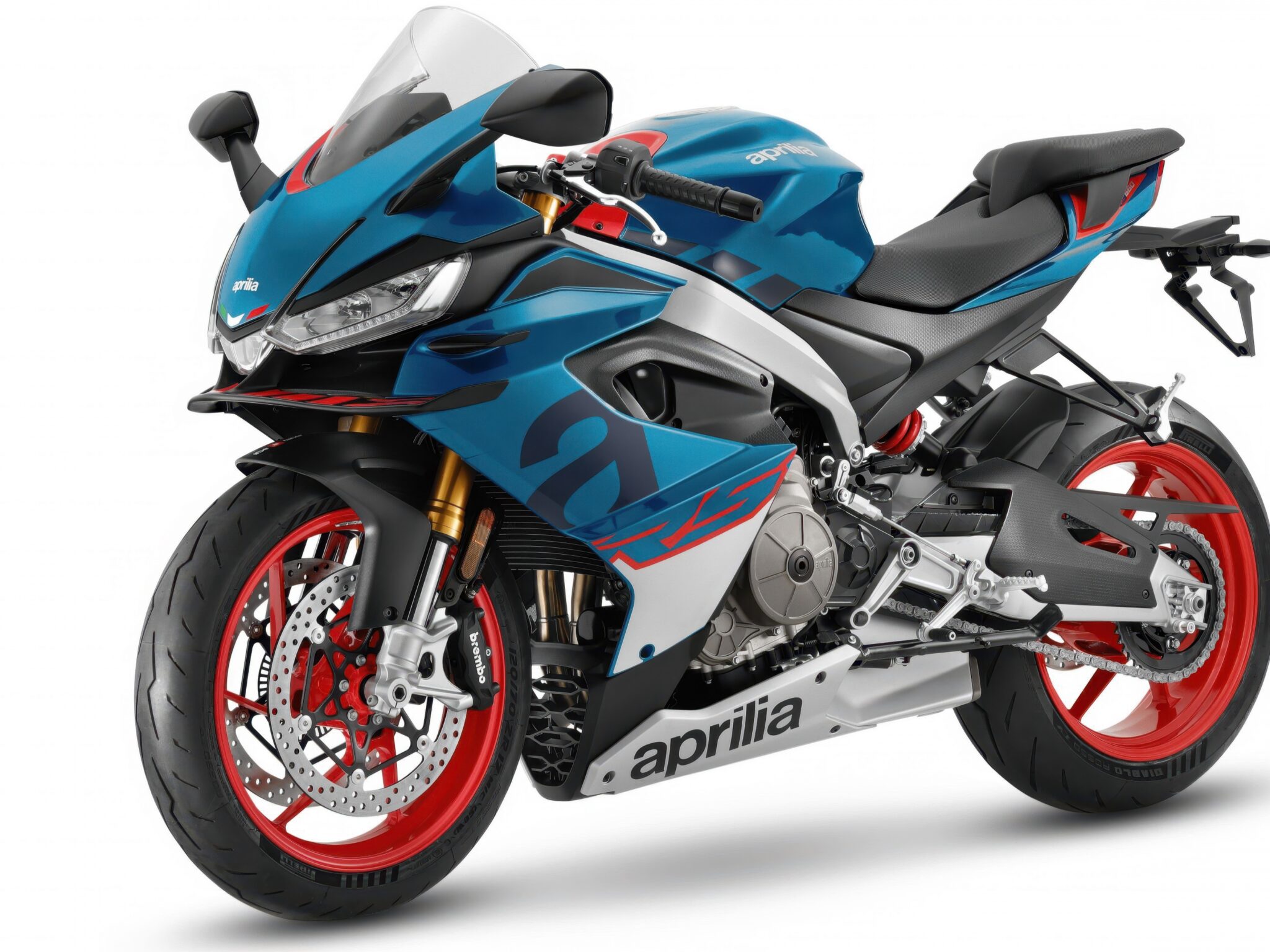 A blue and silver Aprilia RS 660 sport bike is angled against a white background. The metallic silver engine and red wheel accents stand out…