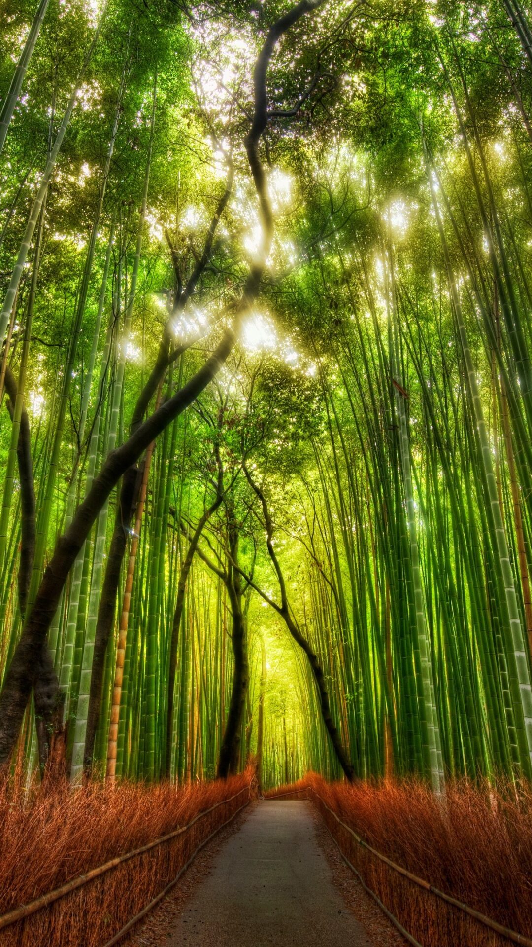 Towering green bamboo stalks create a natural cathedral along this peaceful pathway, with golden sunlight filtering through the dense canopy…