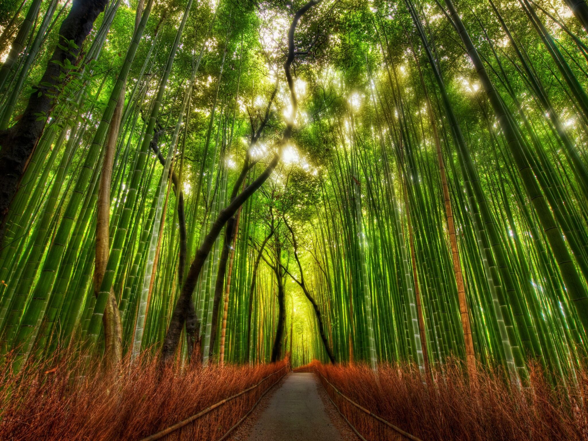 Towering green bamboo stalks create a natural cathedral along this peaceful pathway, with golden sunlight filtering through the dense canopy above. This serene forest scene works beautifully as a desktop wallpaper for 4K monitors.