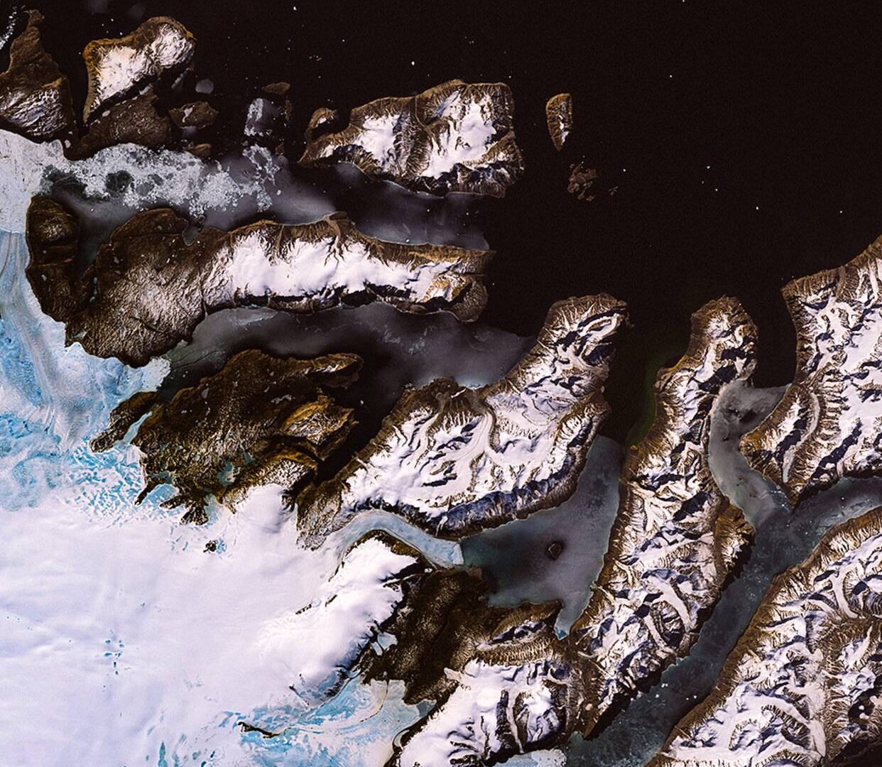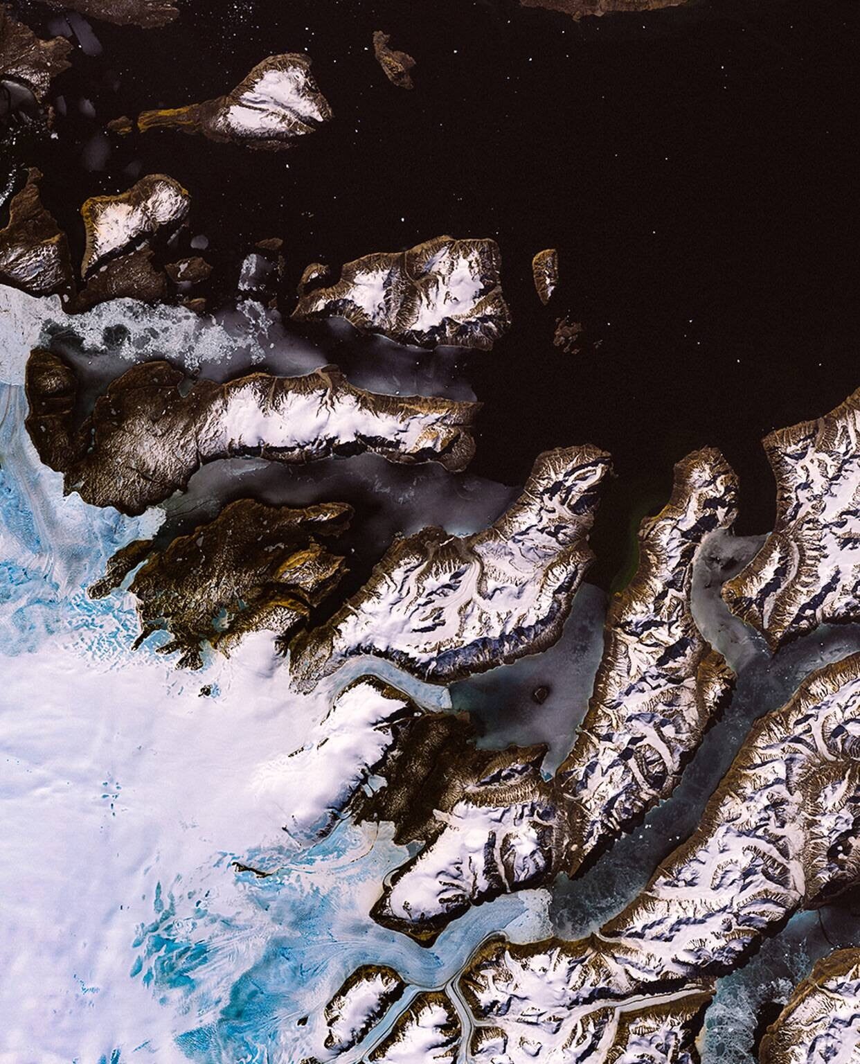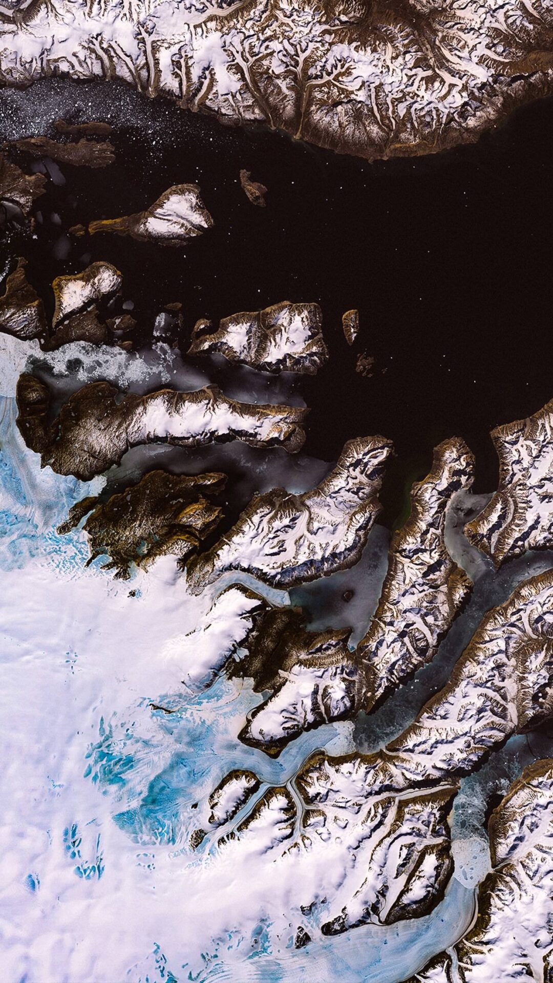 Viewed from high above, a vast frozen landscape unfolds with a dark lake anchoring the top and scattered glacial blue patches glowing below.