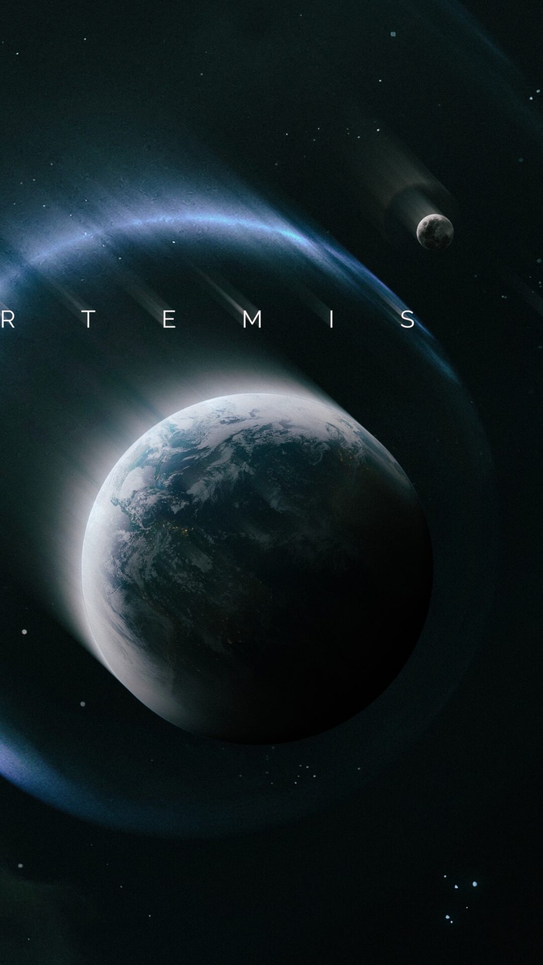 Earth glows with soft whites and grays against the deep black of space, with a sweeping blue-tinted orbital path curving around it and the M…