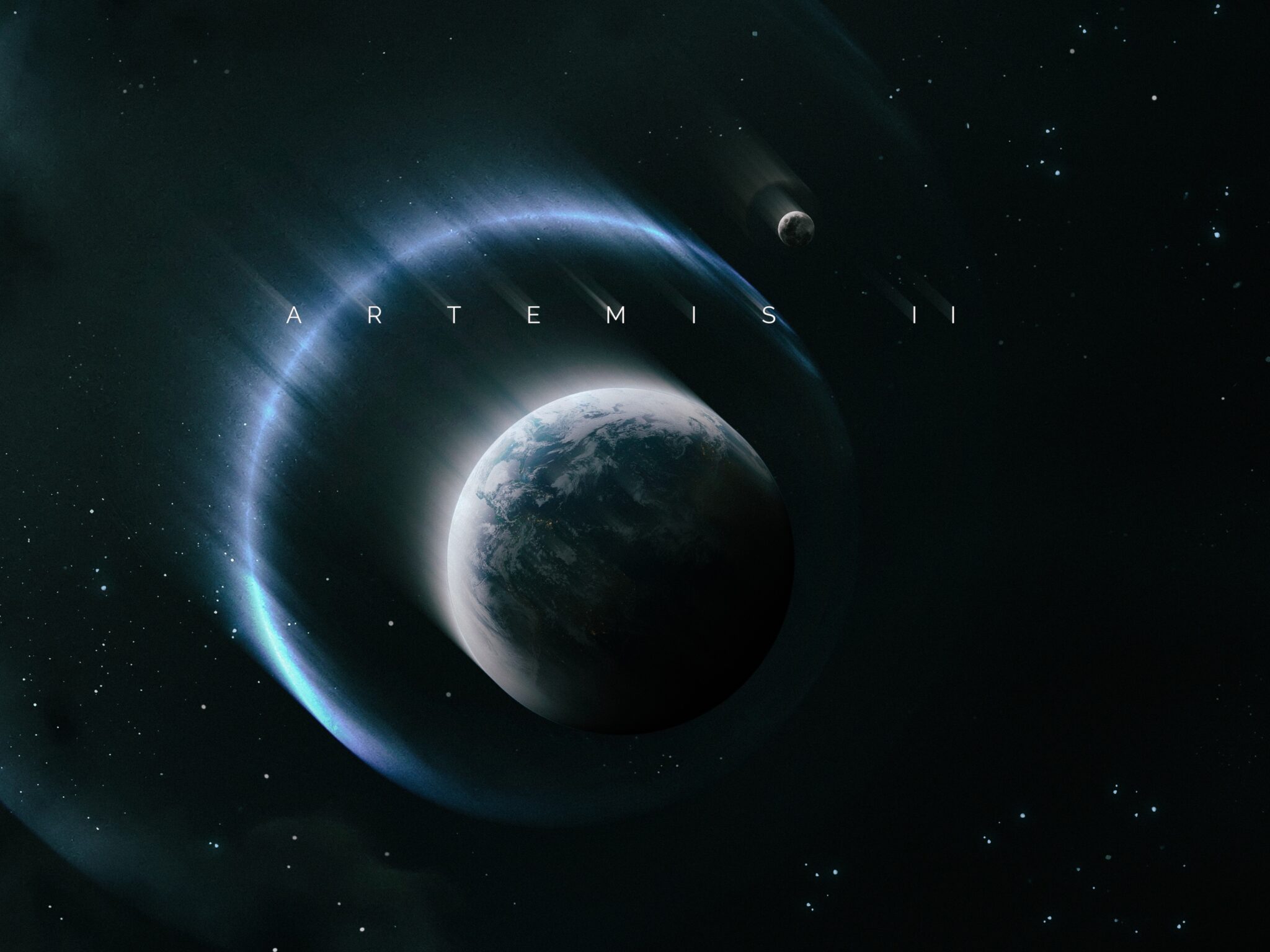 Earth glows with soft whites and grays against the deep black of space, with a sweeping blue-tinted orbital path curving around it and the Moon visible in the distance. For 4K monitors at 3840x2160.