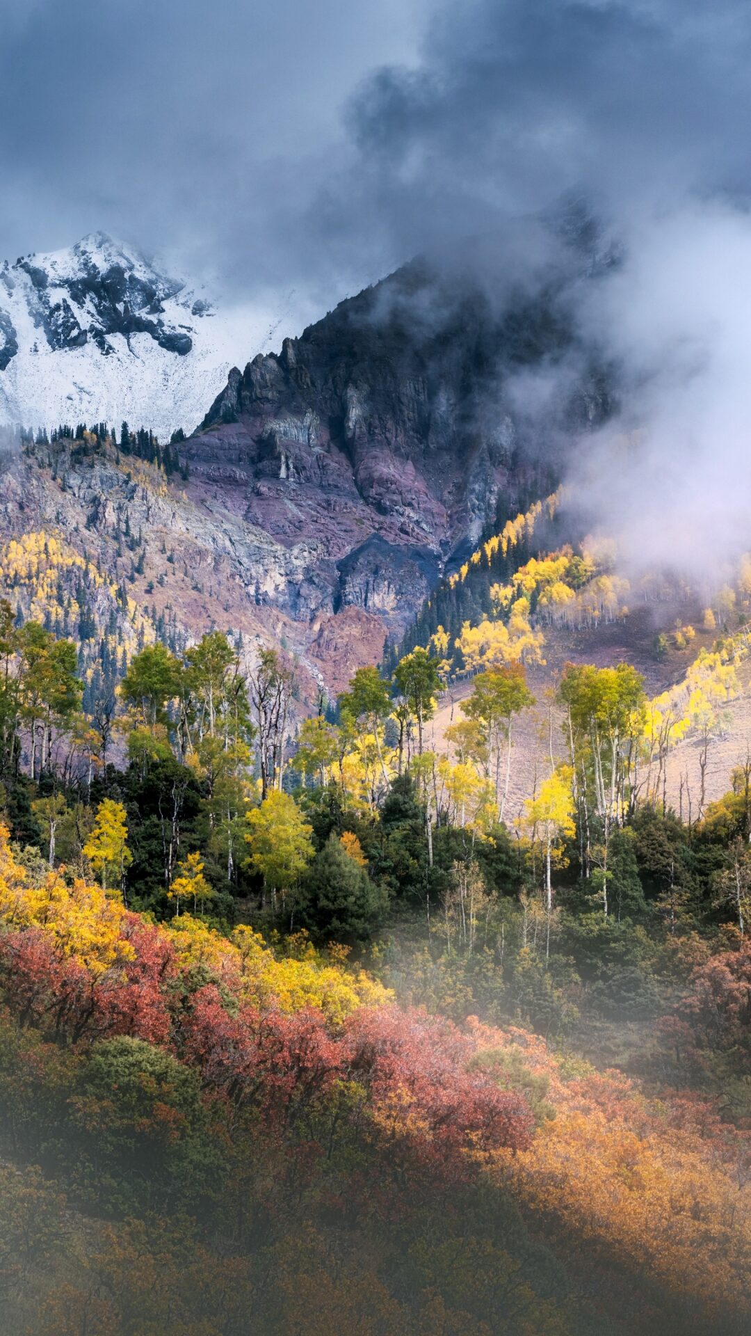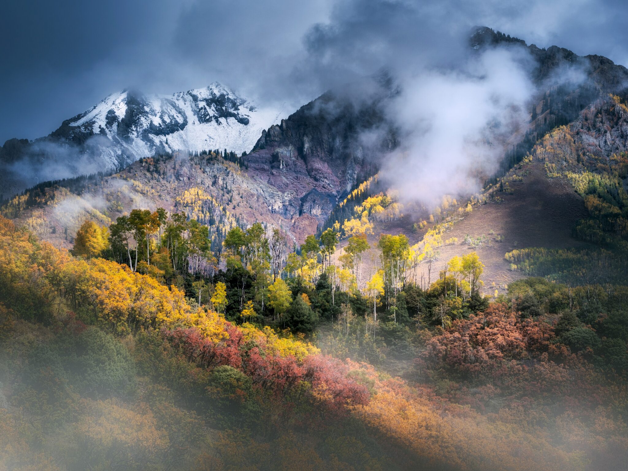 Golden aspen trees create a vibrant tapestry of yellow and orange hues across this misty Colorado valley, while snow-capped peaks emerge through dramatic clouds above. Made for 4K monitors that deserve some serious mountain scenery.