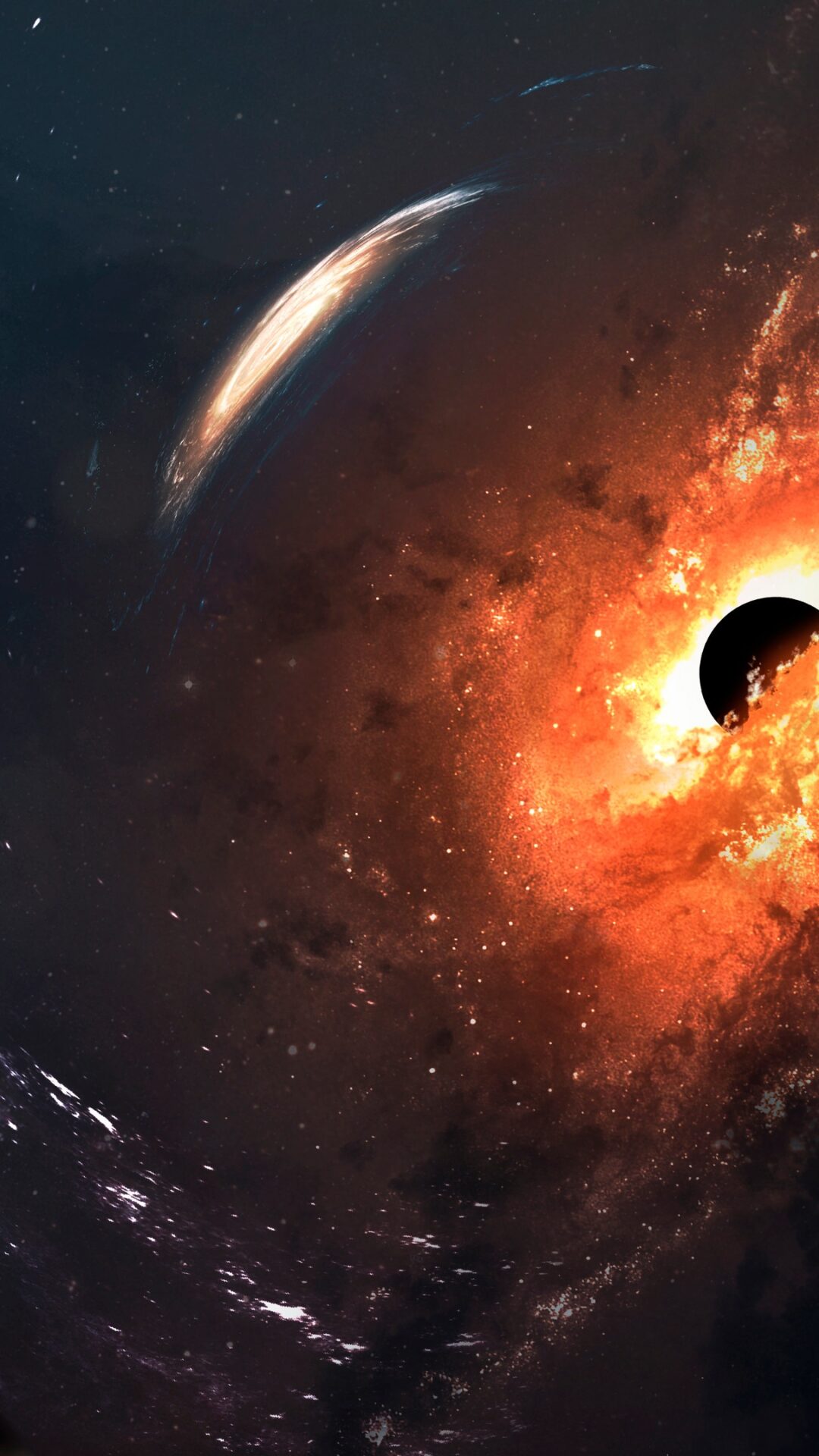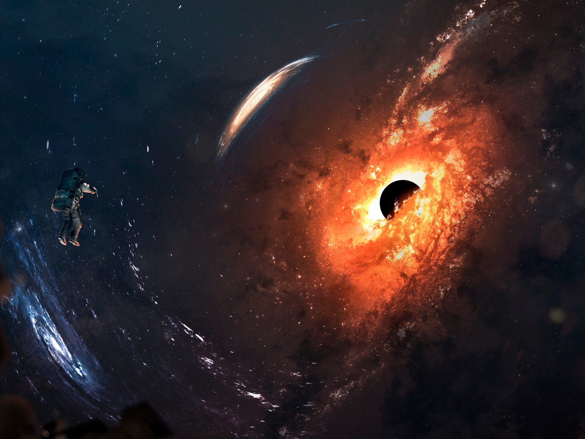 An astronaut floats in space toward a swirling black hole and distant planet. Warm orange and red hues contrast with cooler blues and blacks…
