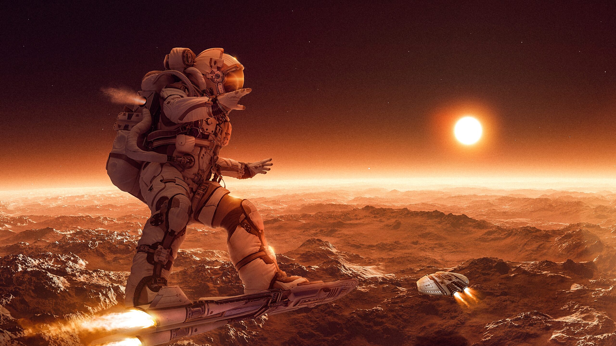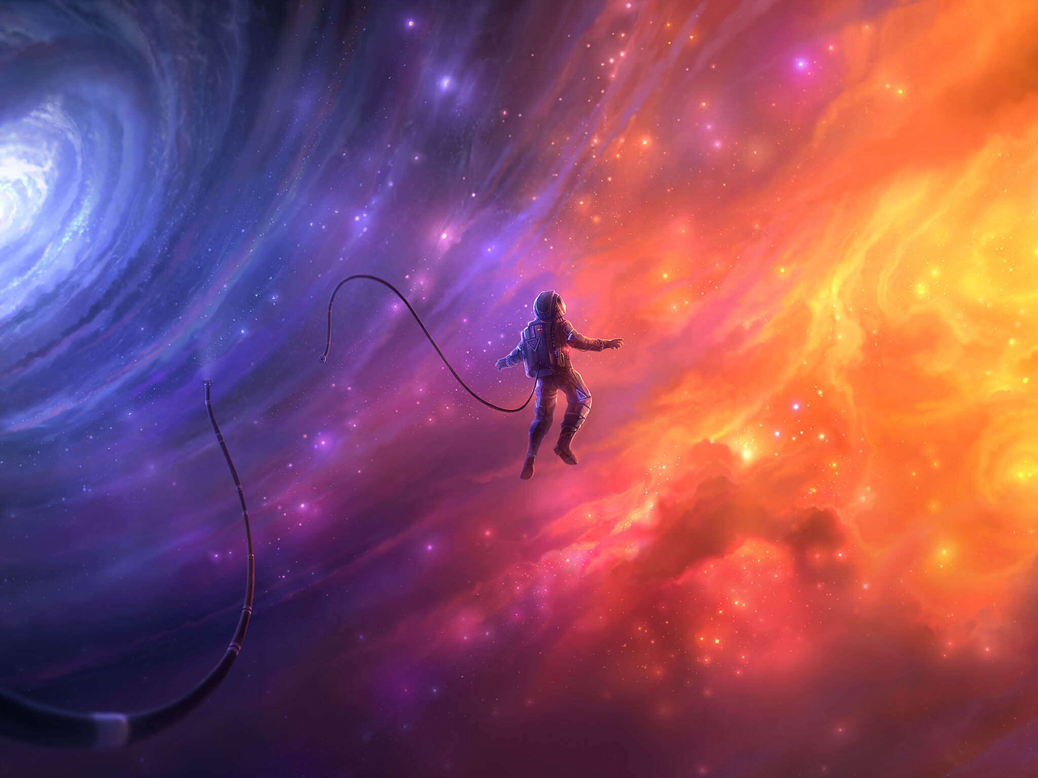 An astronaut floats through vibrant cosmic clouds of deep blue, purple, orange and yellow while tethered to a bright spiral galaxy. This space art wallpaper works well for 4K desktop backgrounds and ultrawide monitors.