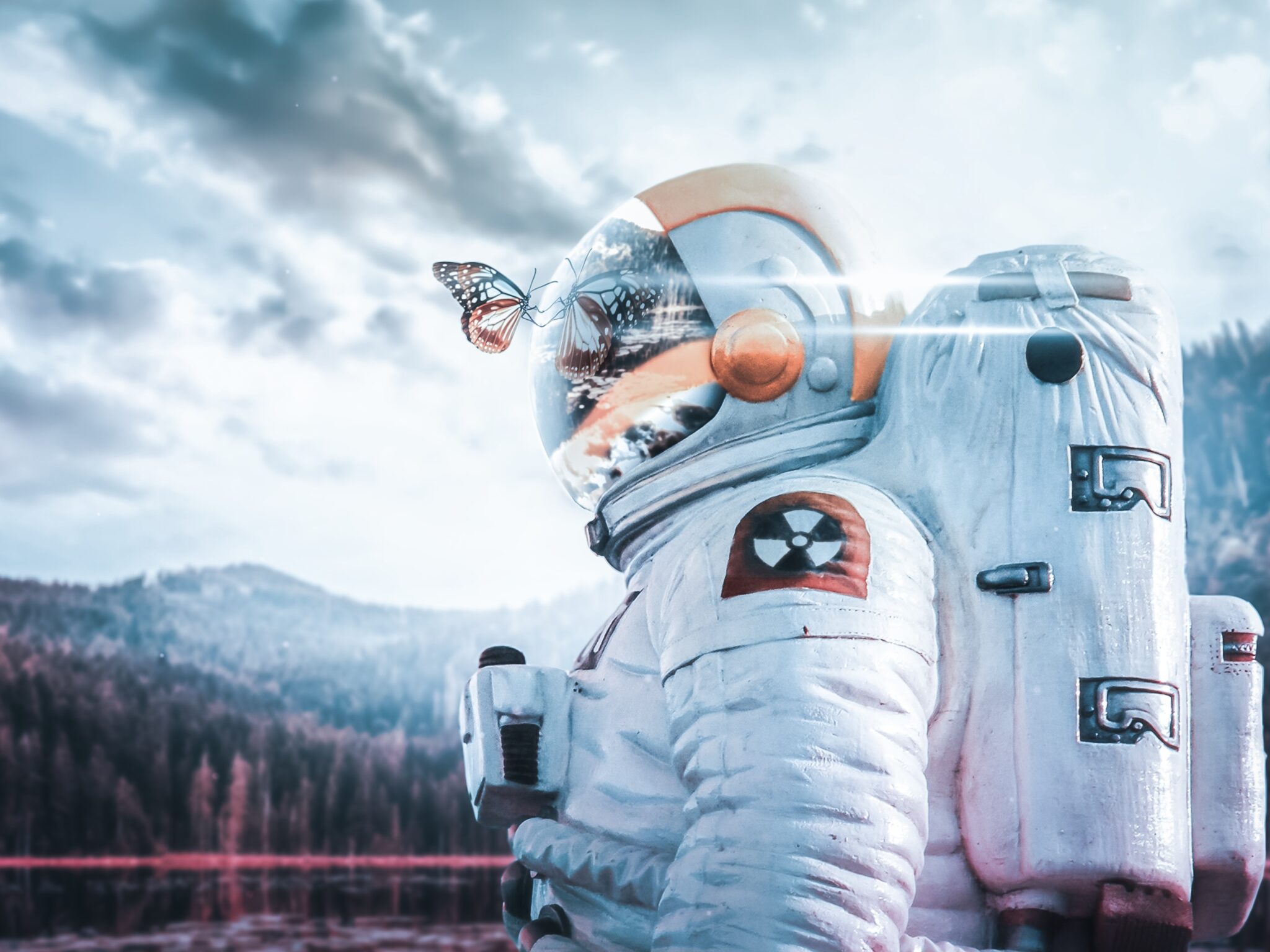 An astronaut in a white spacesuit is positioned in front of a forested mountain range. A monarch butterfly flies near the reflective visor, with dramatic clouds and soft light creating depth.