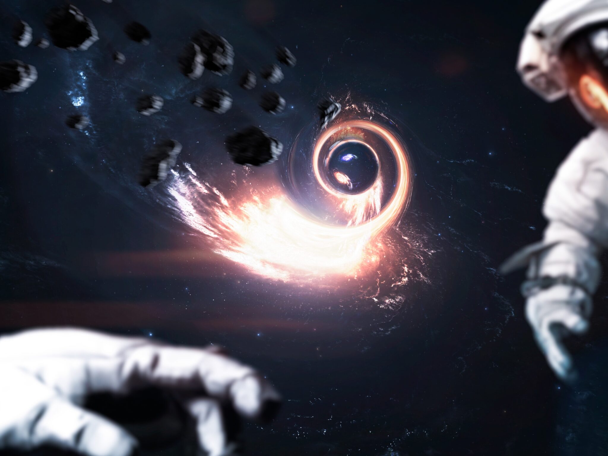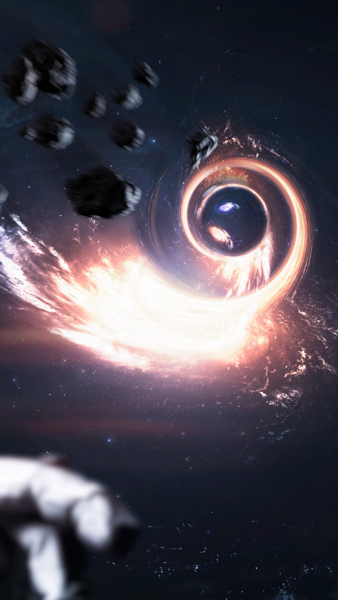 An astronaut drifts through deep space near a glowing orange spiral surrounded by dark asteroids and cosmic debris. This dramatic space scen…