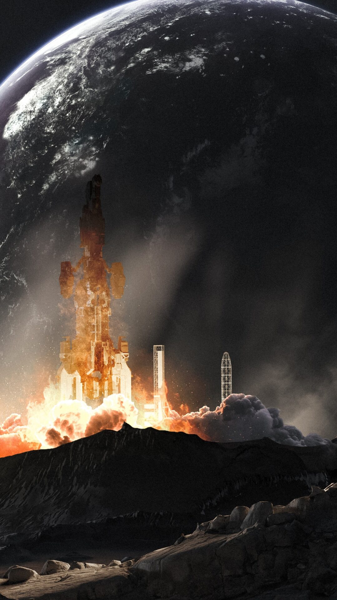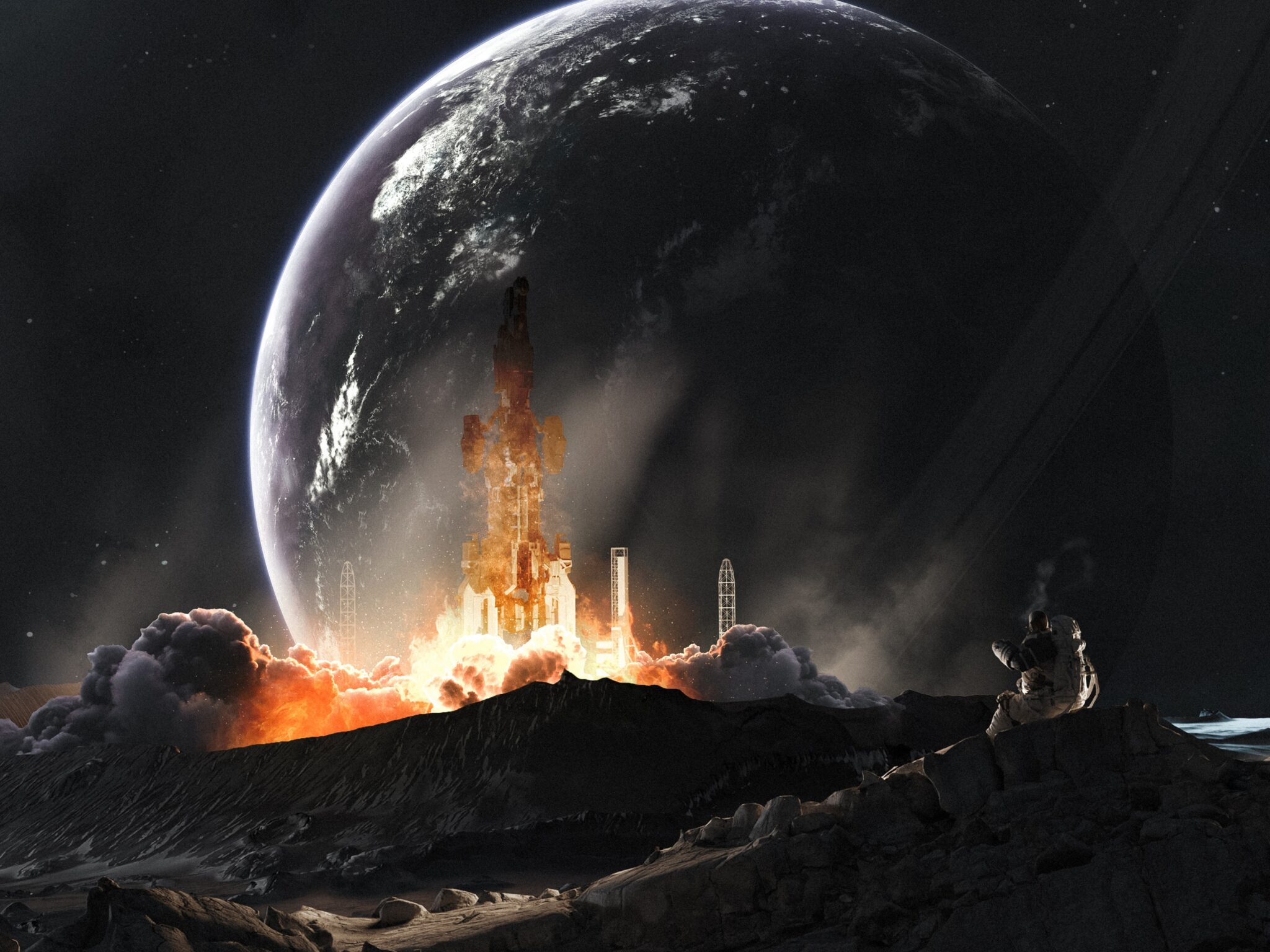 An astronaut silhouetted against rocky terrain watches orange flames burst from a rocket launch while a massive gray and white planet looms