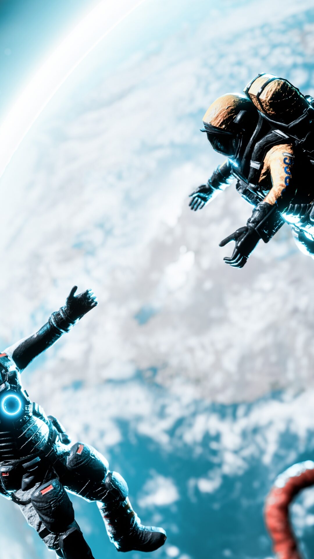 Two astronauts float weightlessly in the cosmic void above a blue and white marbled planet, their red tethering cables spiraling through the starlit darkness. This space wallpaper works well for 4K desktop monitors and ultrawide displays.