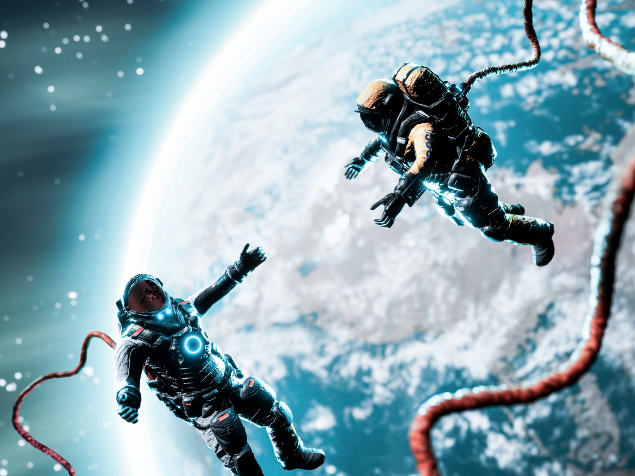 Two astronauts float weightlessly in the cosmic void above a blue and white marbled planet, their red tethering cables spiraling through the…