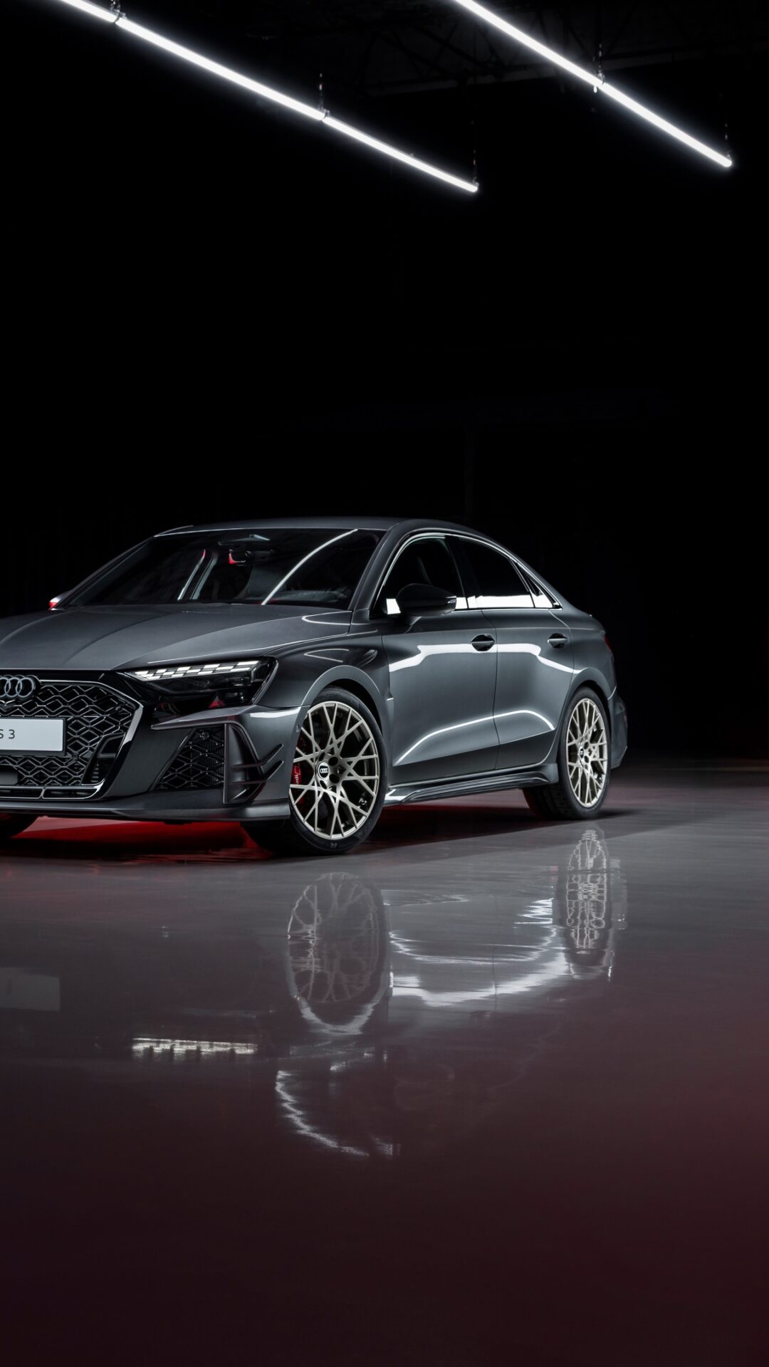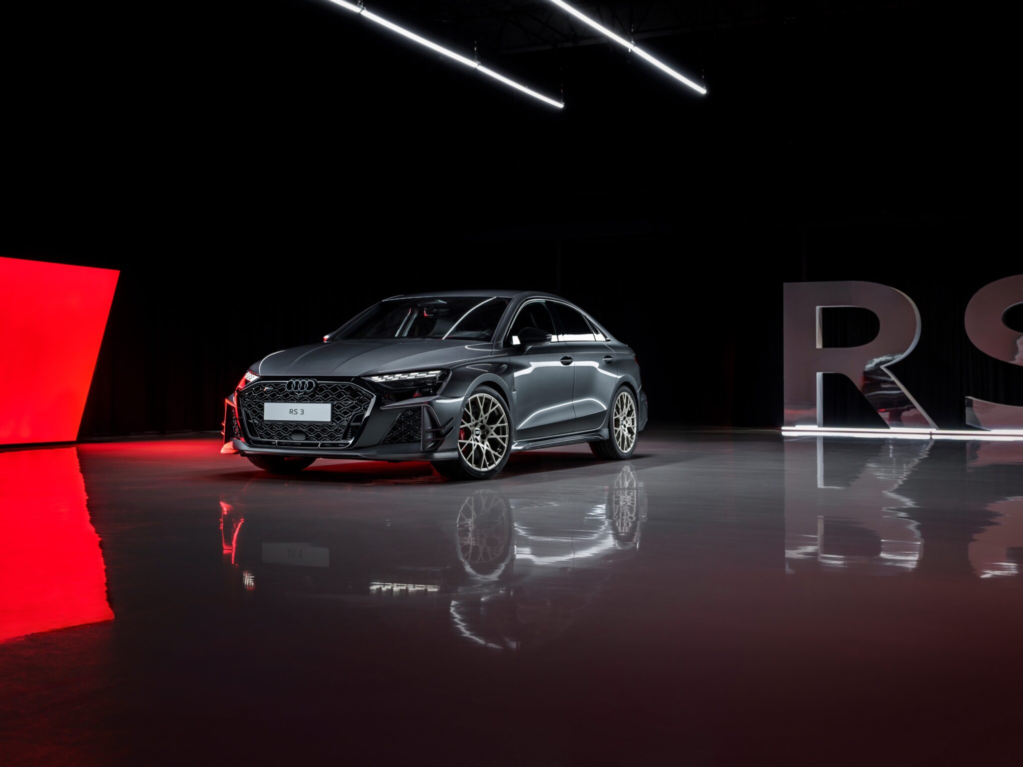 A gray Audi RS 6 Avant is positioned in a dark studio setting with large illuminated 'RS' lettering. Red light casts a glow and reflection o…