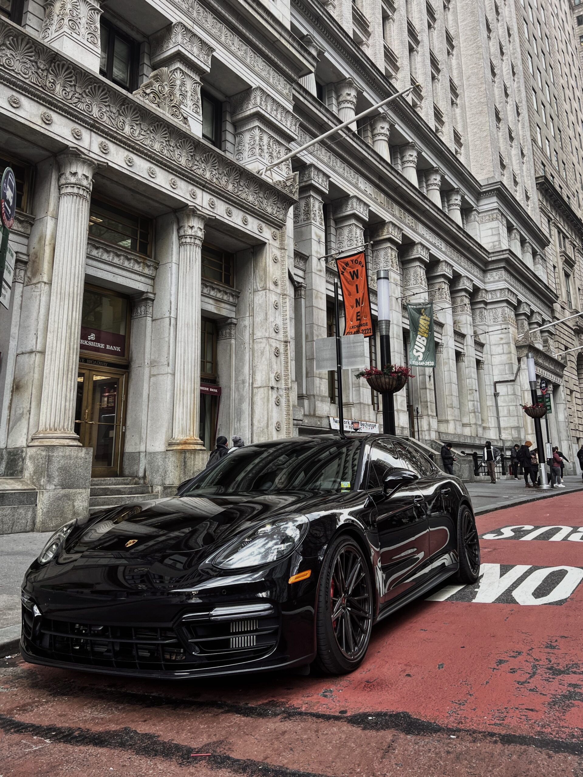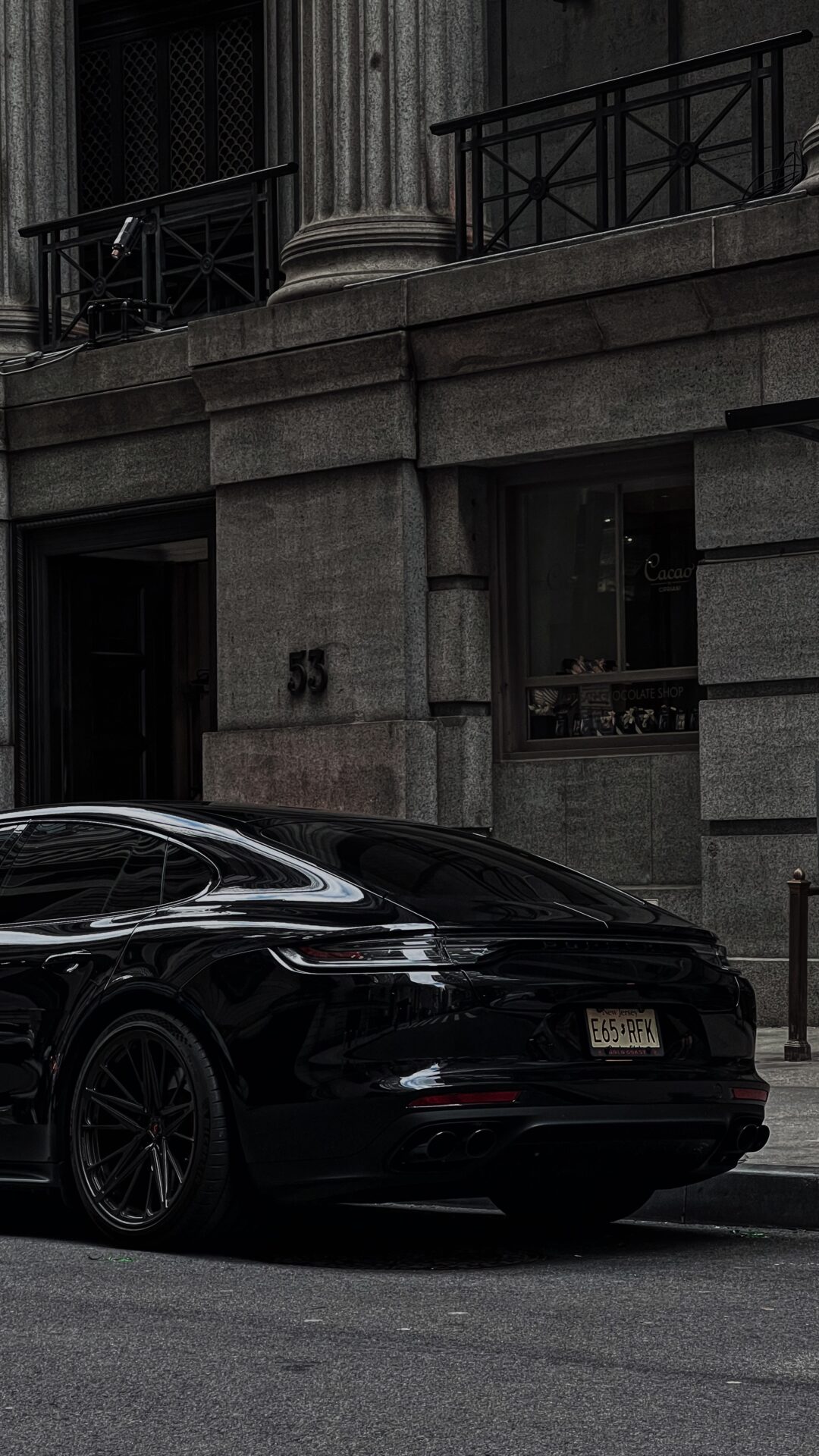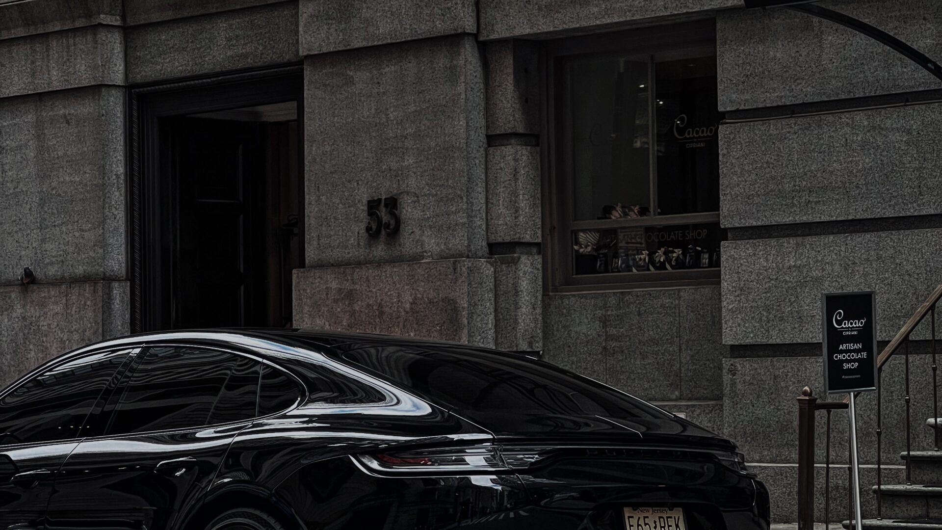 A black Audi RS e-tron GT is parked along a city street next to a stone building. The overall composition uses muted tones and soft shadows