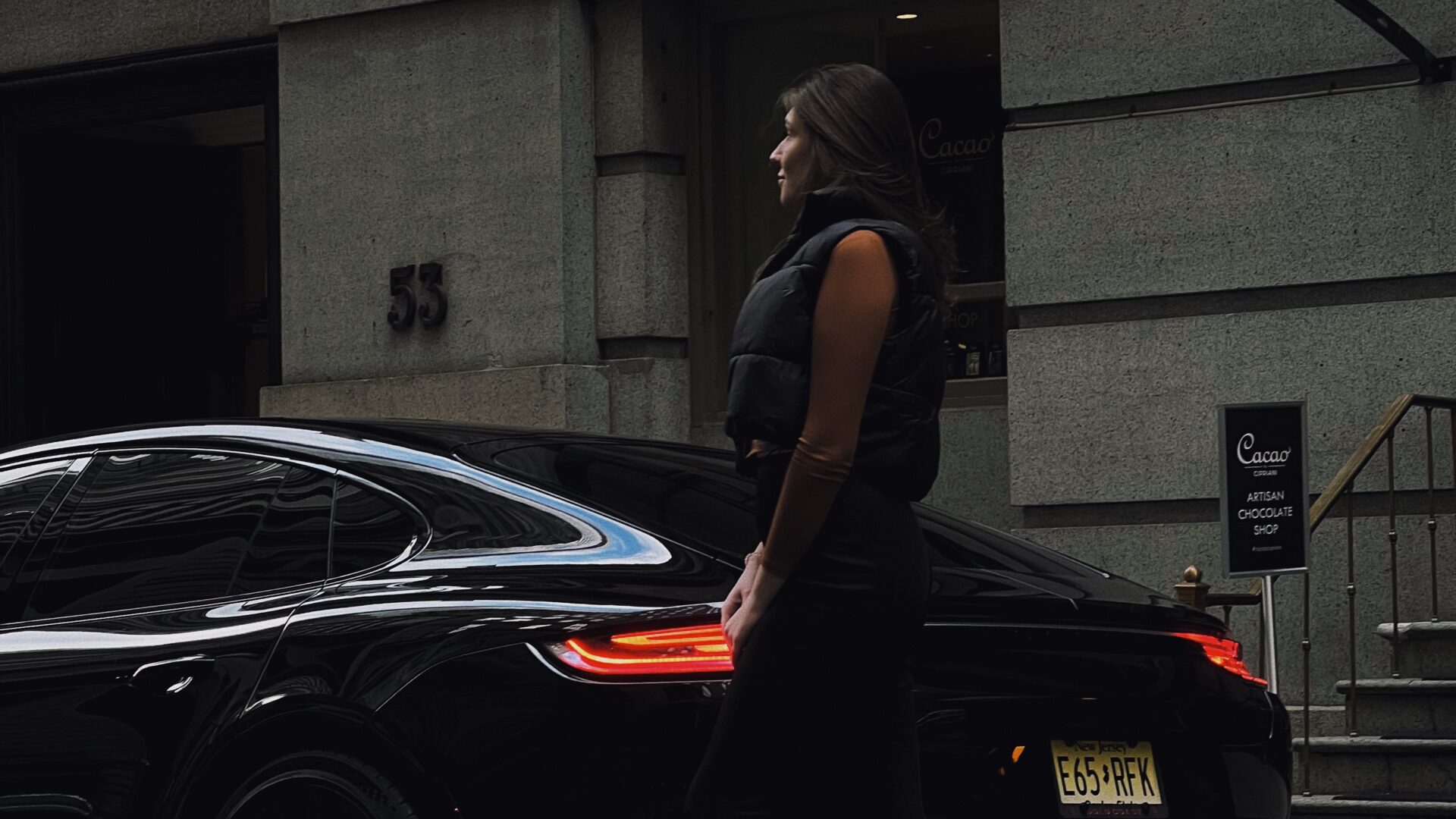 A woman stands next to a dark Audi RS e-tron GT parked on a city street. The building’s stone facade and the car’s glossy finish create a contrast of textures and a subdued color palette.