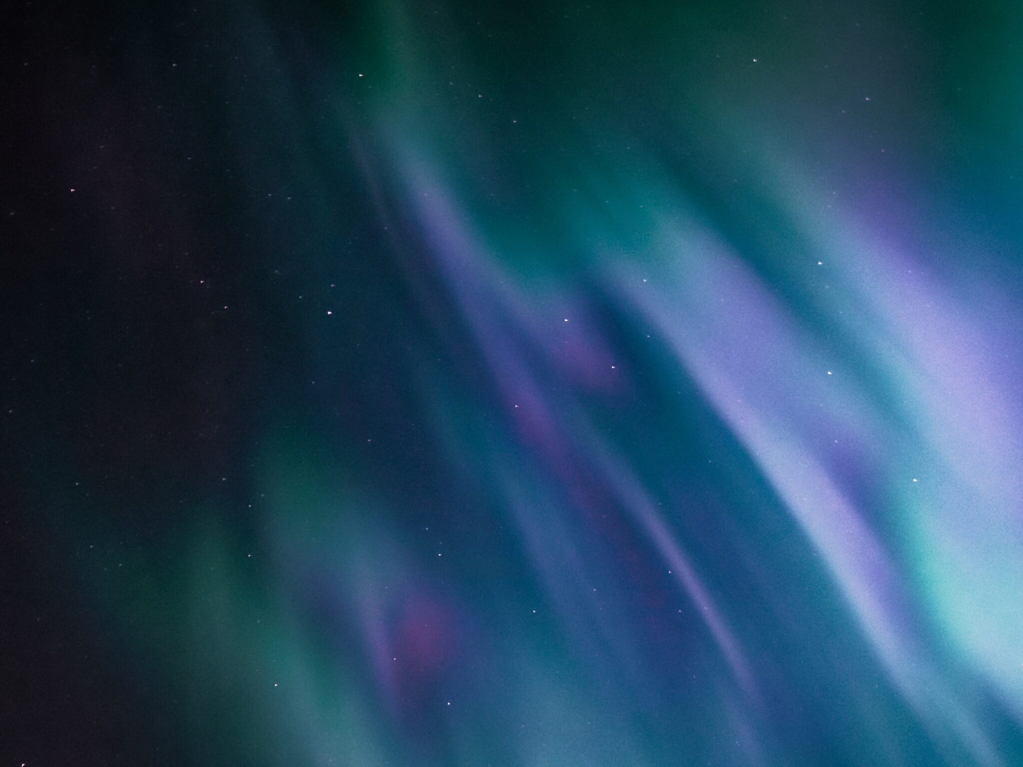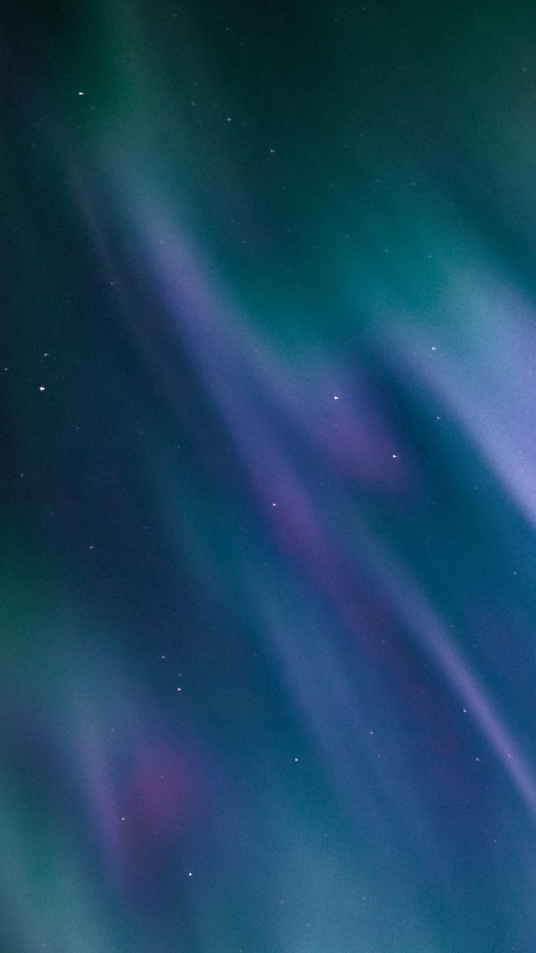 Streaks of green and purple light form an aurora across a dark, starry sky. The light appears soft and diffused with subtle gradients of col…