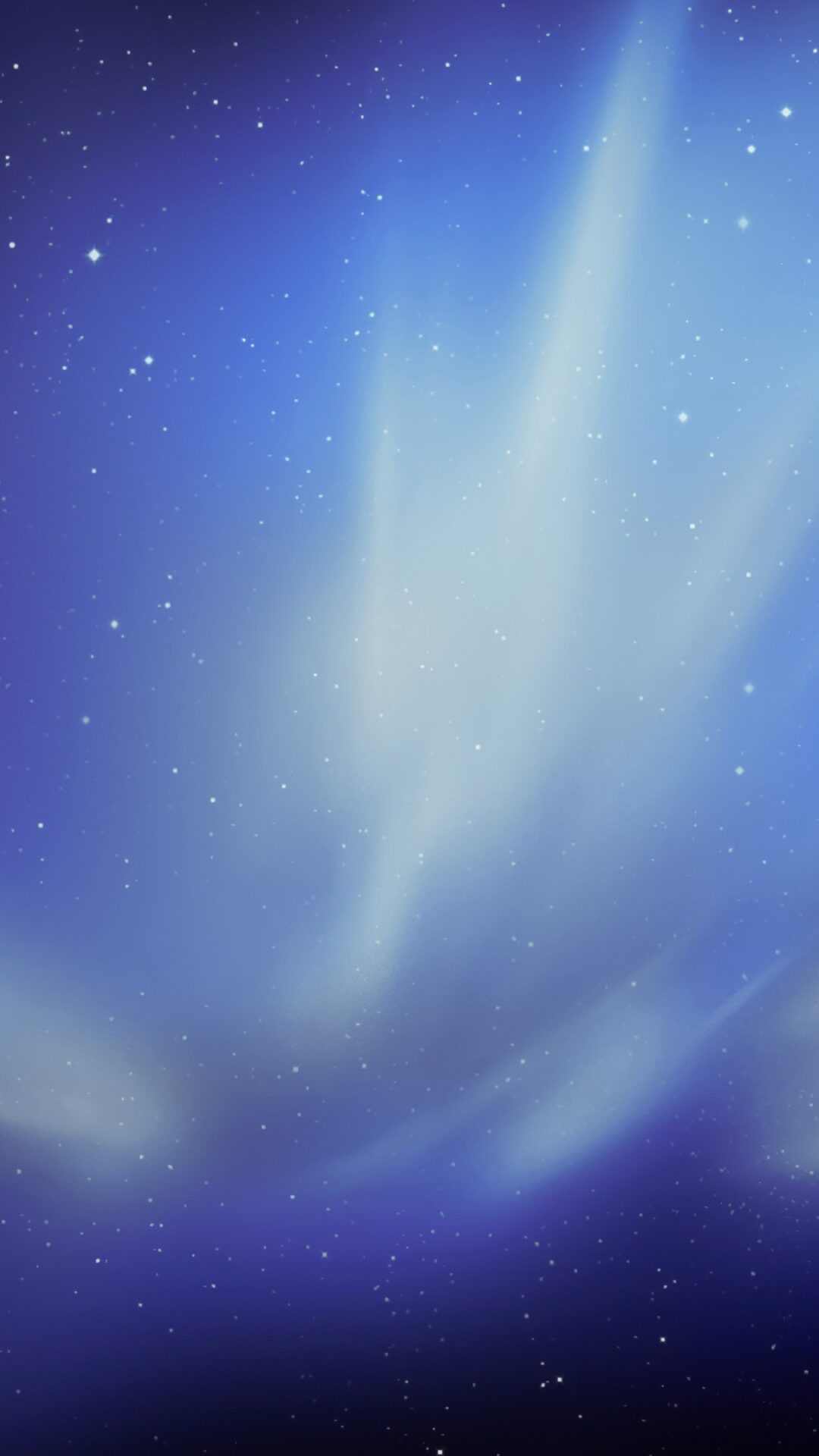 Soft aurora-like rays in pale cyan and white fan upward against a deep violet and blue starfield, giving off that classic Mac OS X Snow Leop…