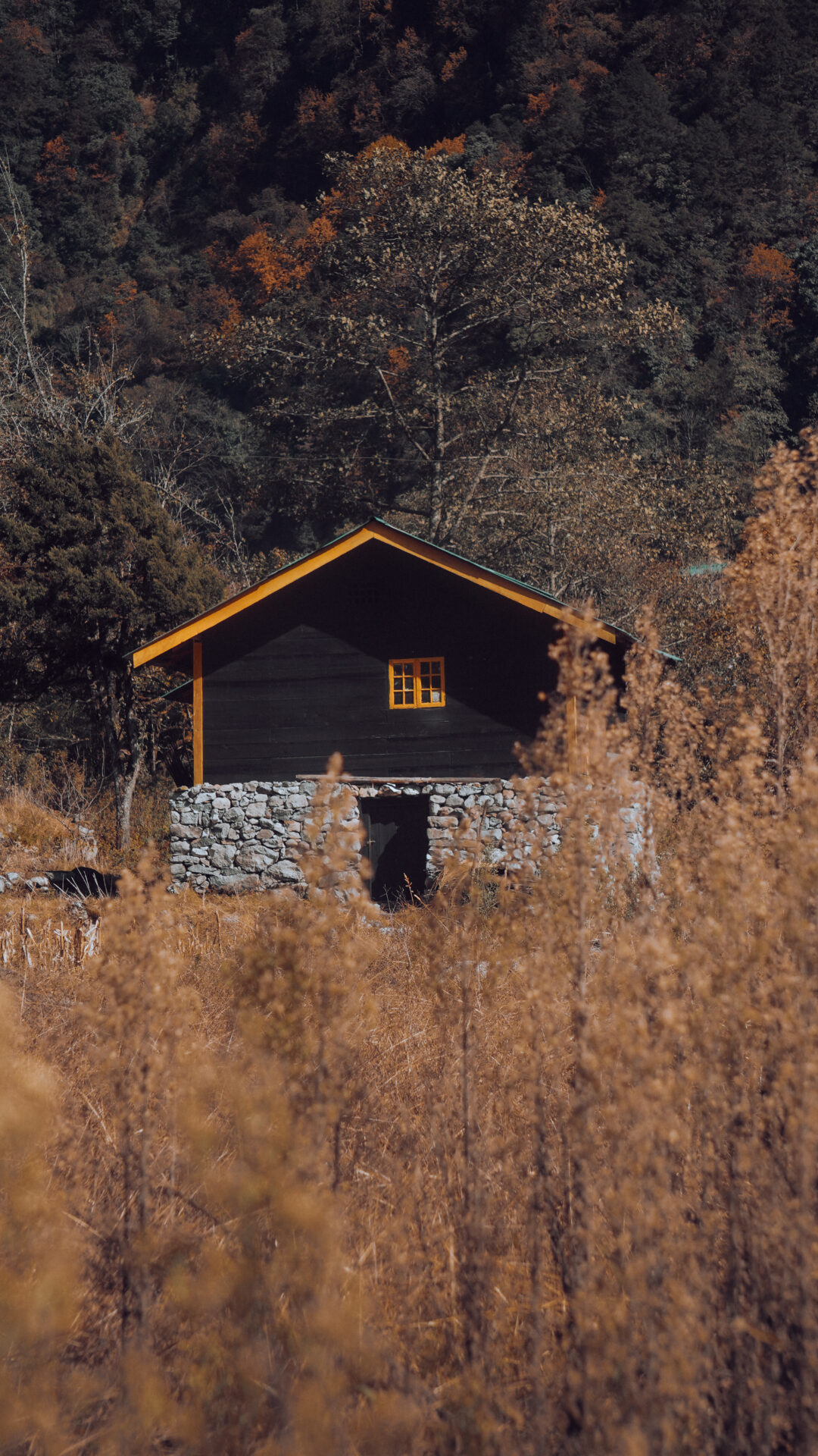 A small dark cabin with a yellow roof sits among dense trees and dry grasses. Warm light from a single window breaks up the dark wood siding…