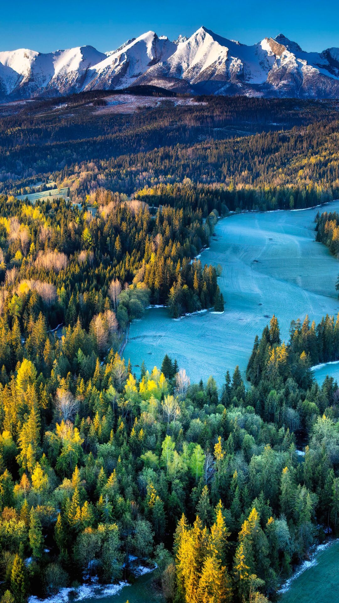 A wide aerial view depicts a dense forest and rolling hills leading to a snow-capped mountain range. The late afternoon sunlight casts long shadows and highlights the changing colors of the trees in shades of green, yellow and gold.