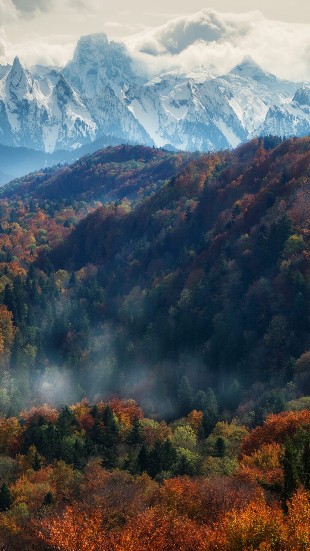 A dense forest hillside slopes up towards a jagged mountain range under a cloudy sky. The trees display a warm range of autumn colors, with …