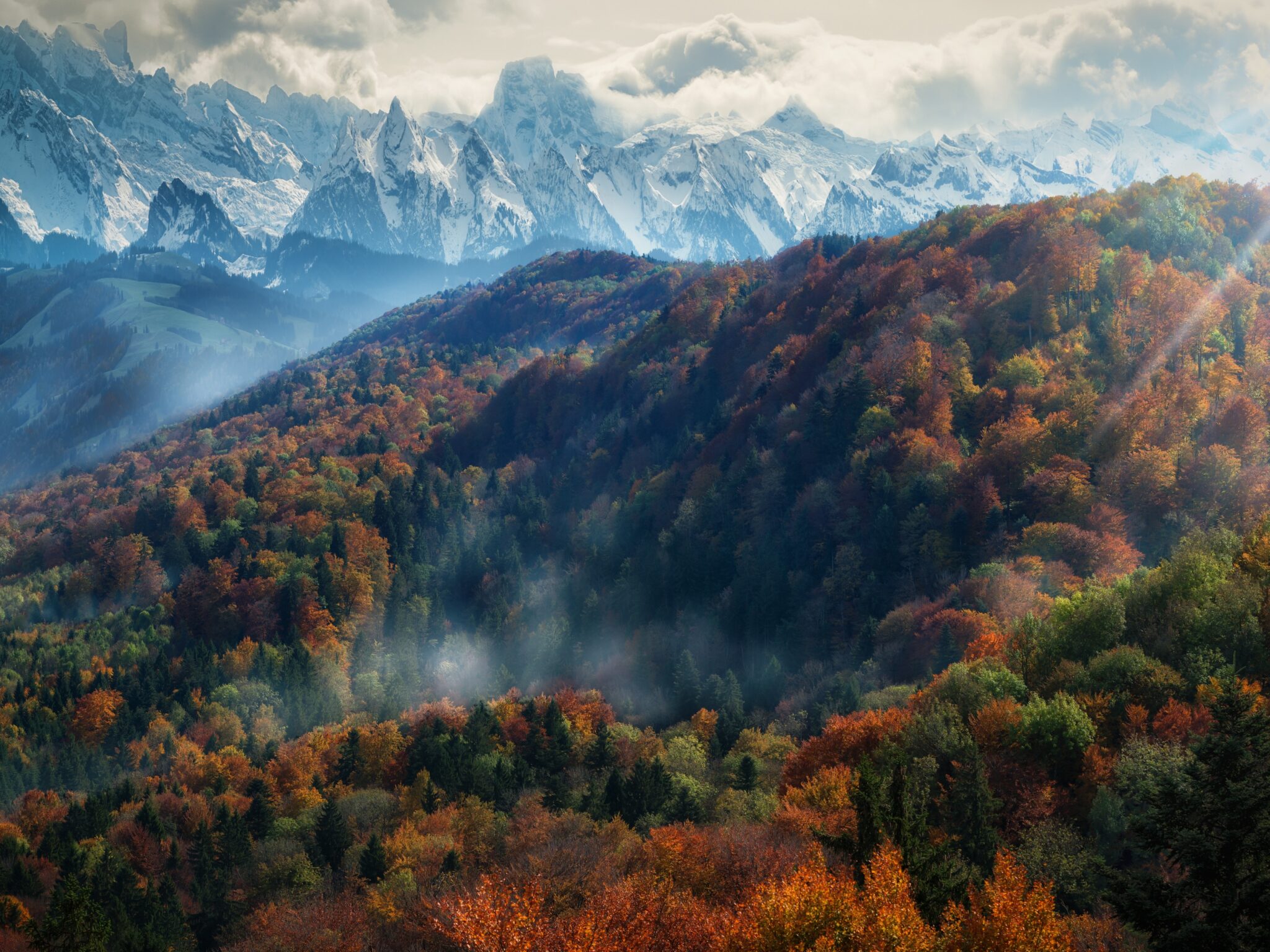 A dense forest hillside slopes up towards a jagged mountain range under a cloudy sky. The trees display a warm range of autumn colors, with sunlight creating a soft glow through the foliage.