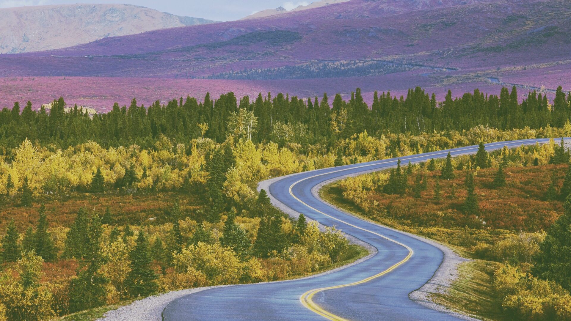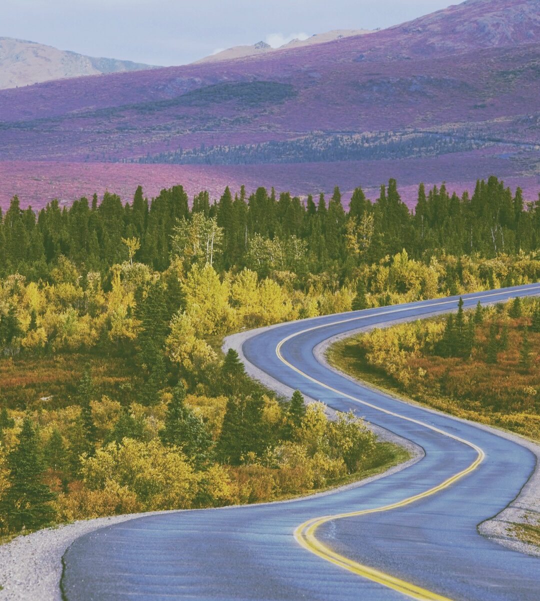 A two-lane road curves through a blaze of fall color, flanked by evergreens and golden deciduous trees with rugged peaks in the distance. The palette of yellow, orange, and deep purple hillside makes it feel like a drive you never want to end.