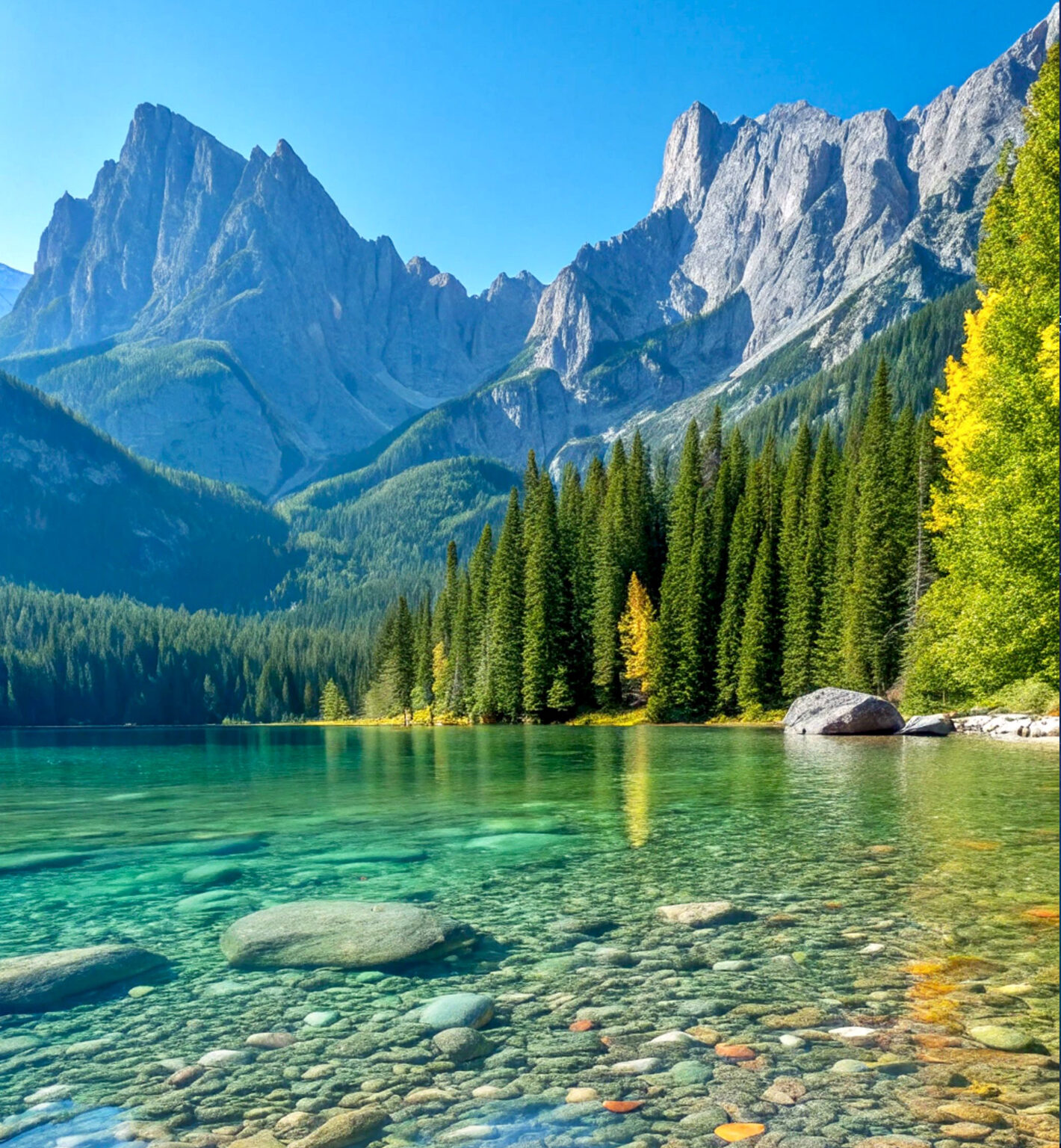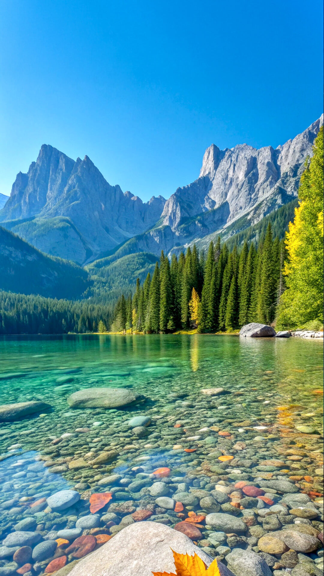 A turquoise lake sits beneath a rugged mountain range, densely lined with evergreen trees. A single yellow leaf rests on a smooth, grey rock in the clear, shallow water near the shore.