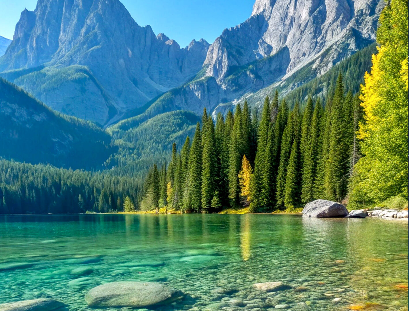 A turquoise lake sits beneath a rugged mountain range, densely lined with evergreen trees. A single yellow leaf rests on a smooth, grey rock…