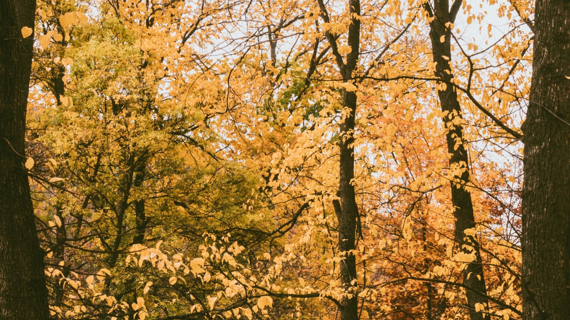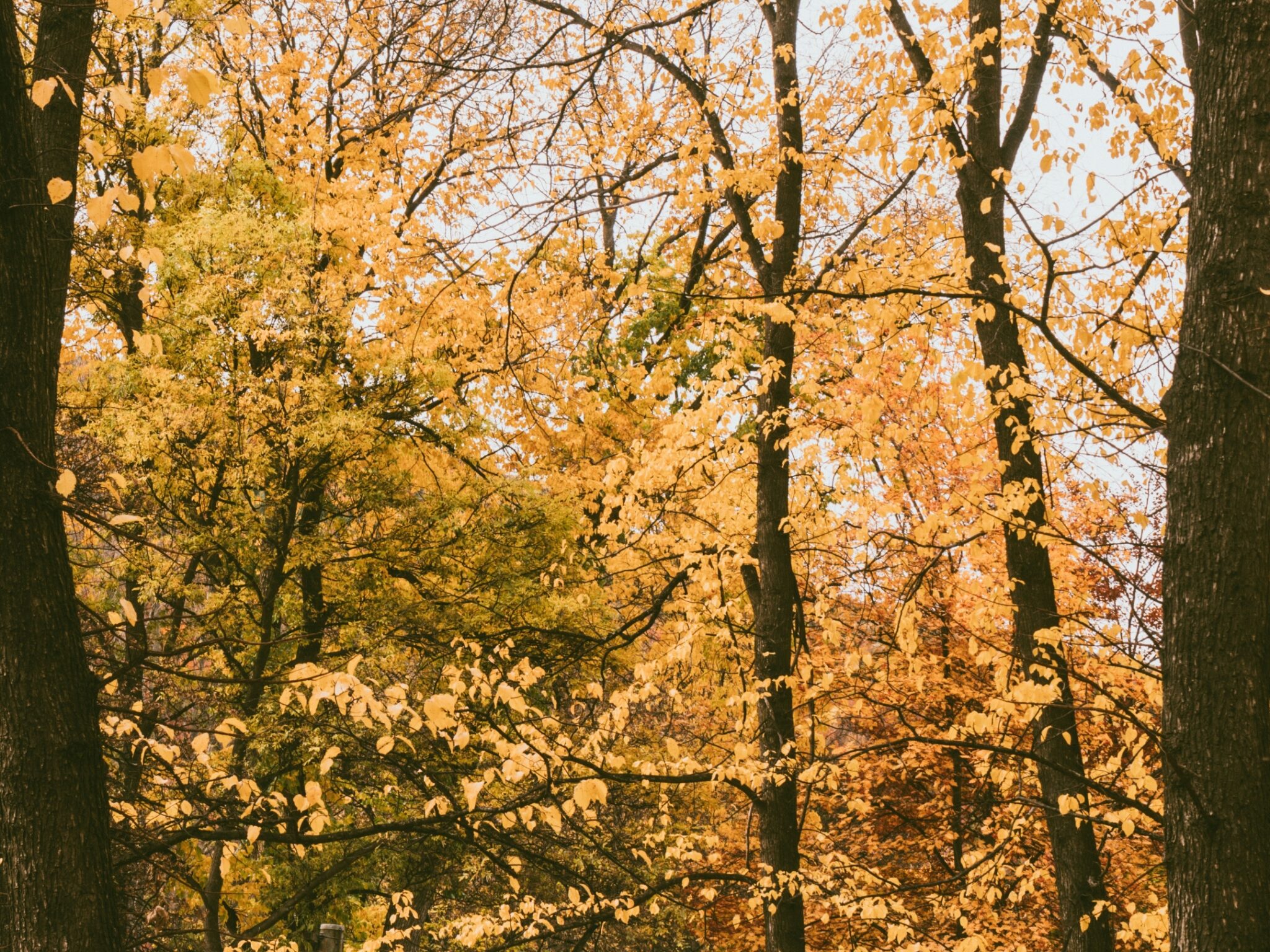 Yellow and orange trees line a quiet gravel path dusted with fallen leaves, a lone bench sitting beneath the canopy. The pale sky and soft d…