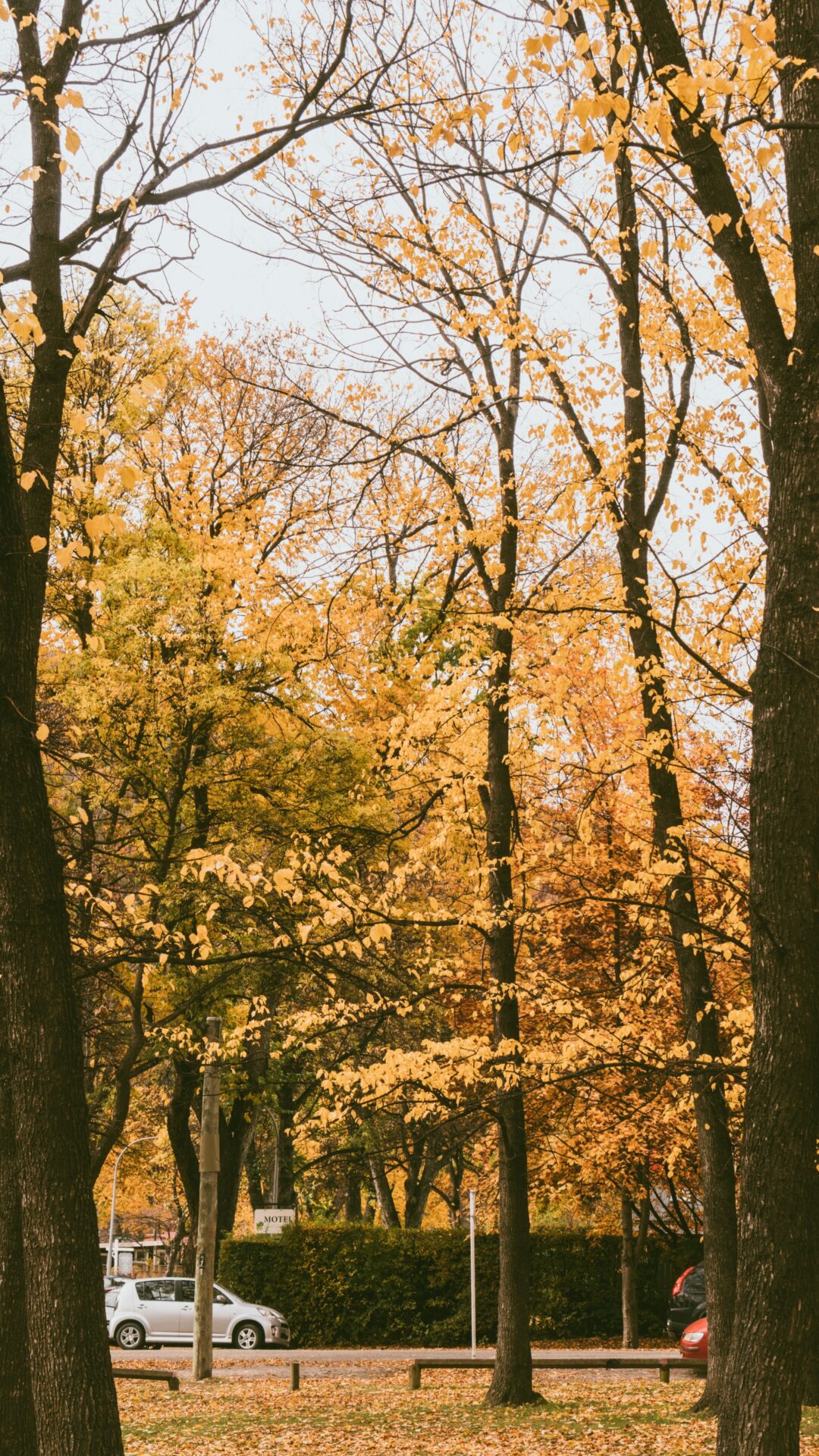 Bare and golden trees line a street with passing cars and a low green hedge. Diffuse light softens the yellow and brown foliage, creating a …