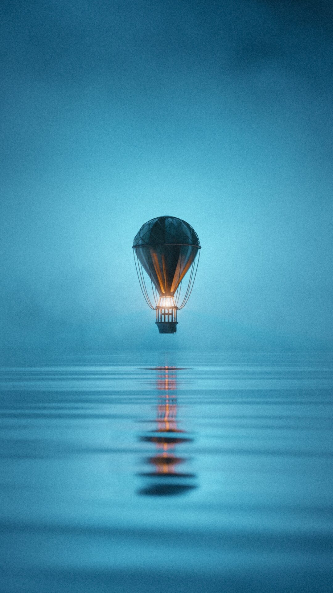 Glowing hot air balloon floating low over calm water in deep teal and navy fog, with warm amber light reflecting on the rippled surface below. For 4K monitors, this photography wallpaper brings a dreamy, atmospheric vibe to your desktop.