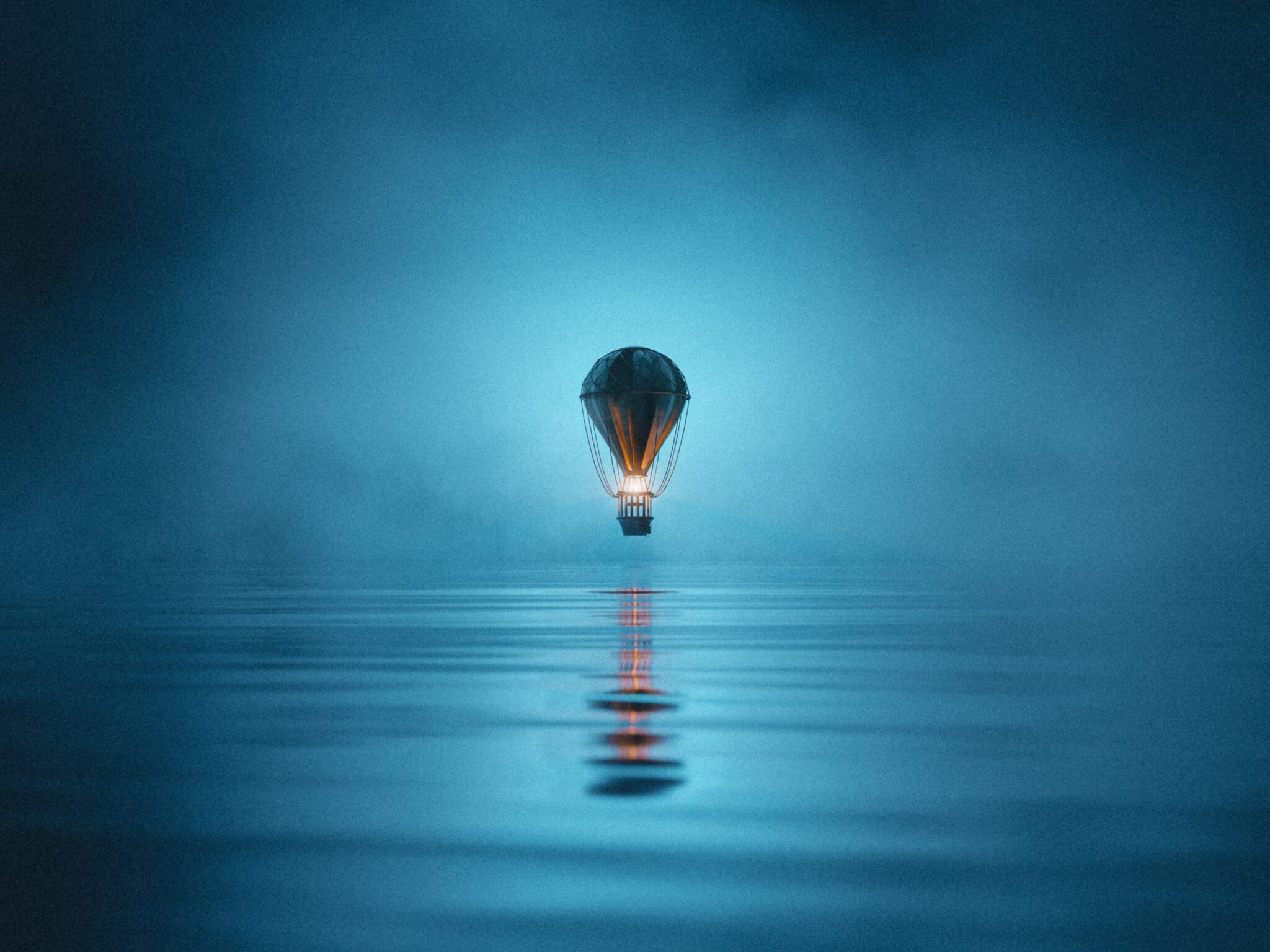 Glowing hot air balloon floating low over calm water in deep teal and navy fog, with warm amber light reflecting on the rippled surface belo…