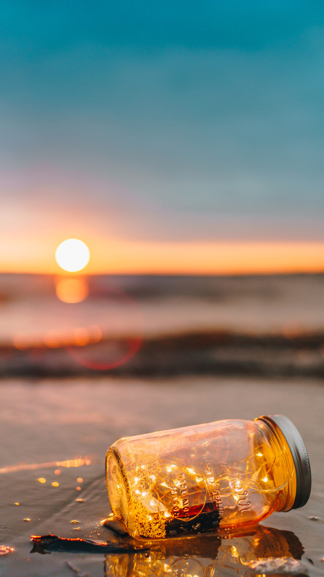 A glass jar filled with small lights rests on a wet, sandy beach at sunset. The warm glow of the lights contrasts with the cool tones of the…