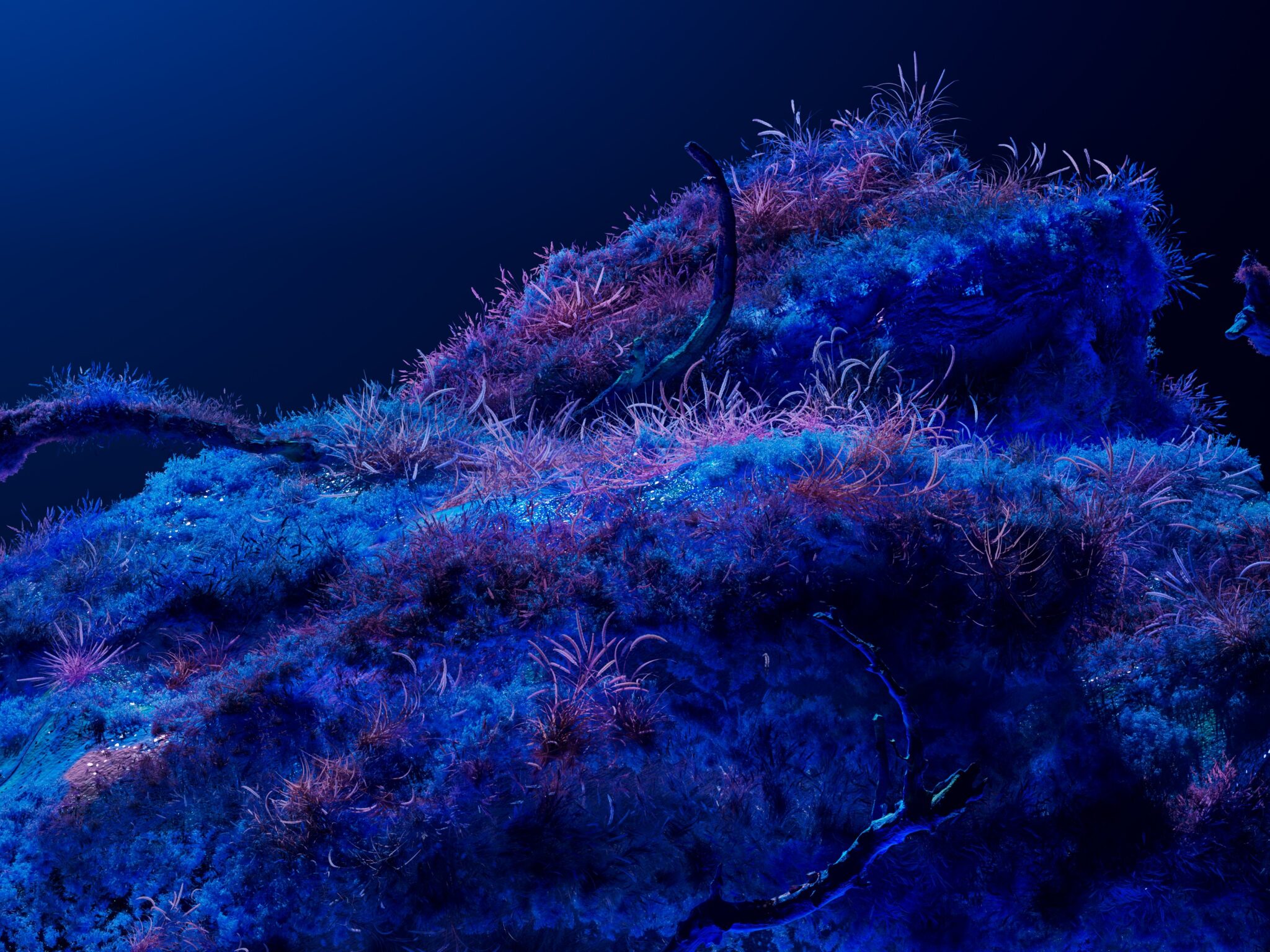 Deep blue textures covered in feathery pink and purple growths that look like underwater coral or alien moss, all glowing with that dreamy b…