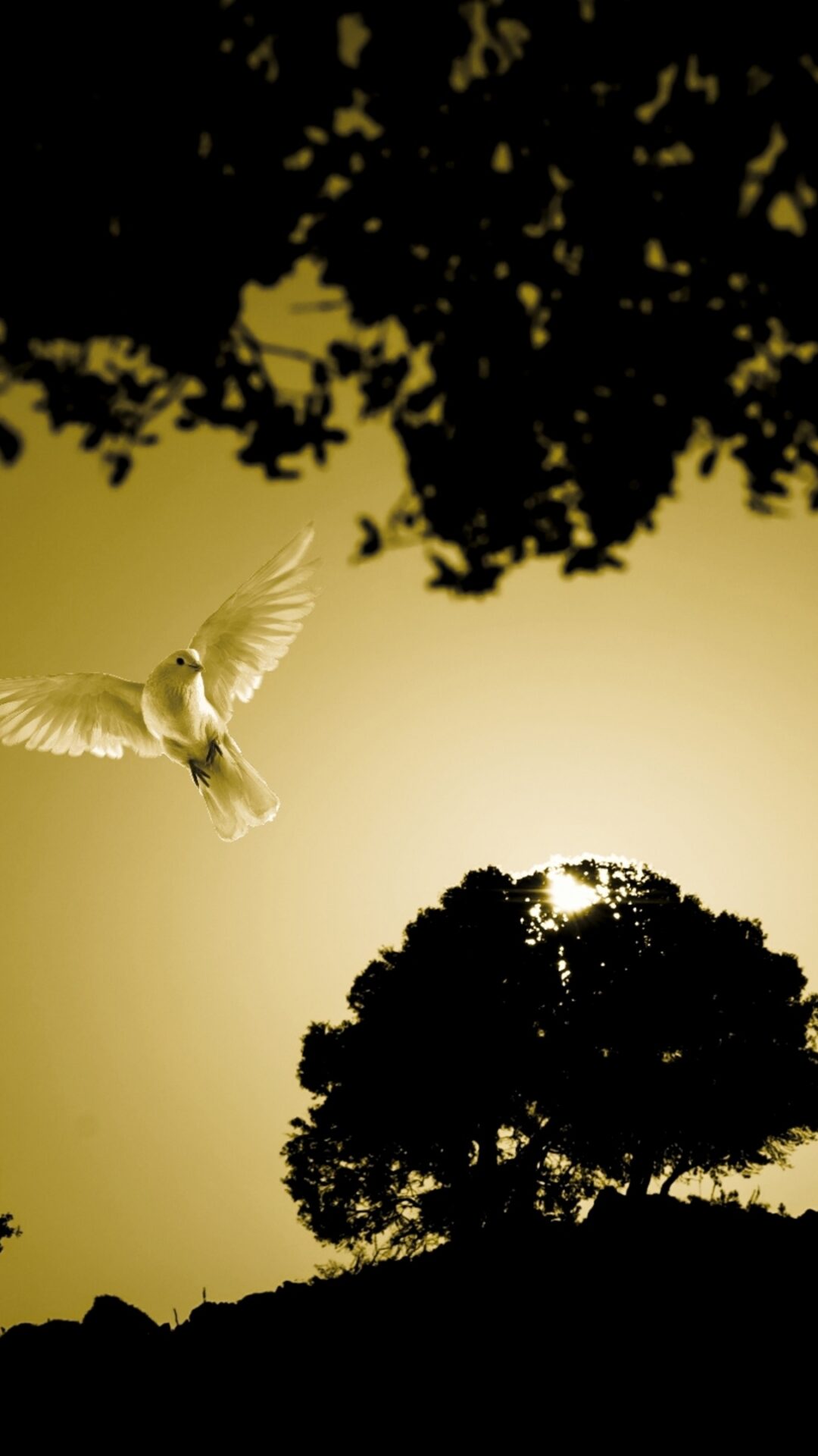 A bird flies silhouetted against a bright, golden sky. Dark branches frame the scene, creating a vignette effect and emphasizing the central…