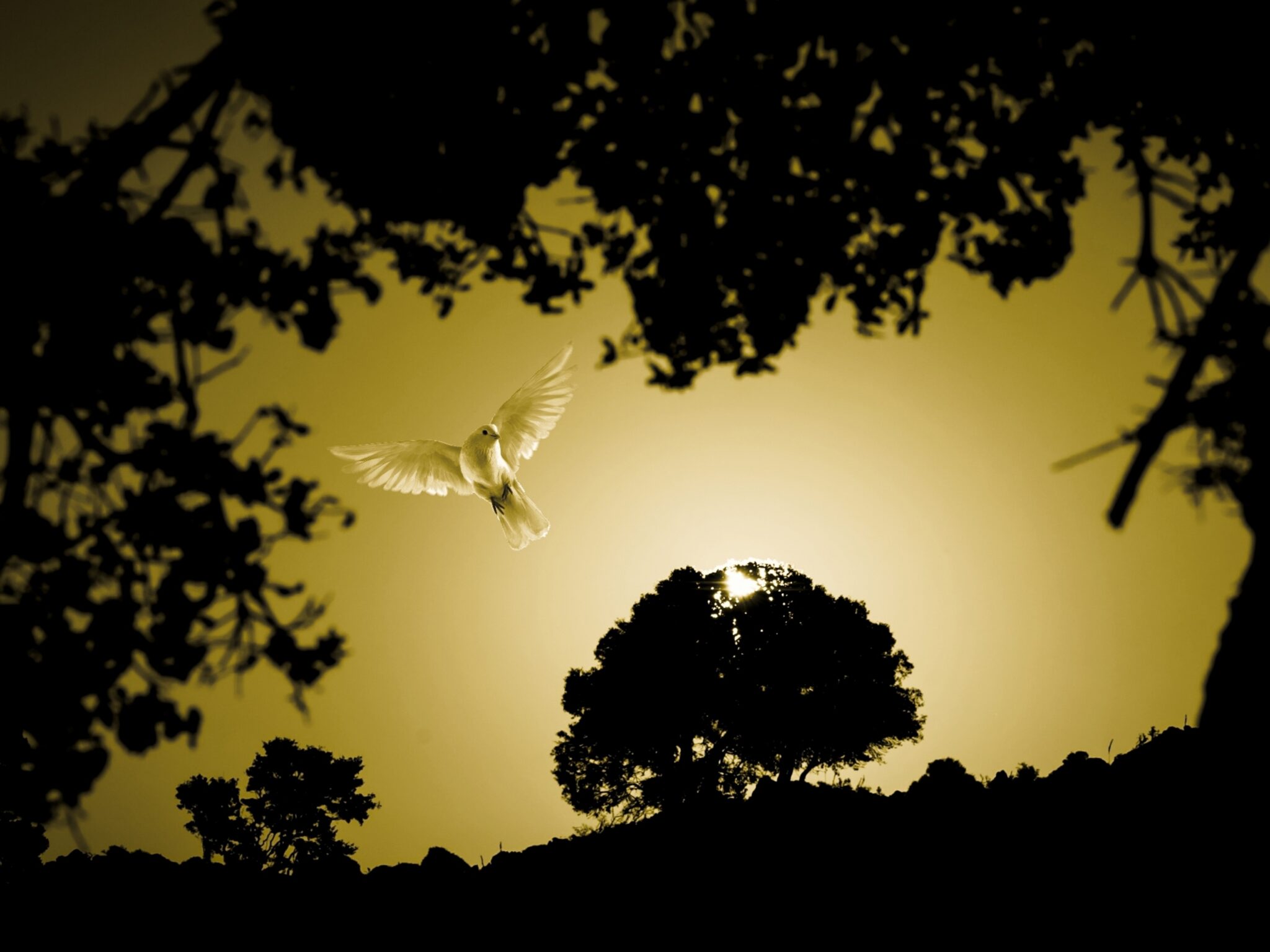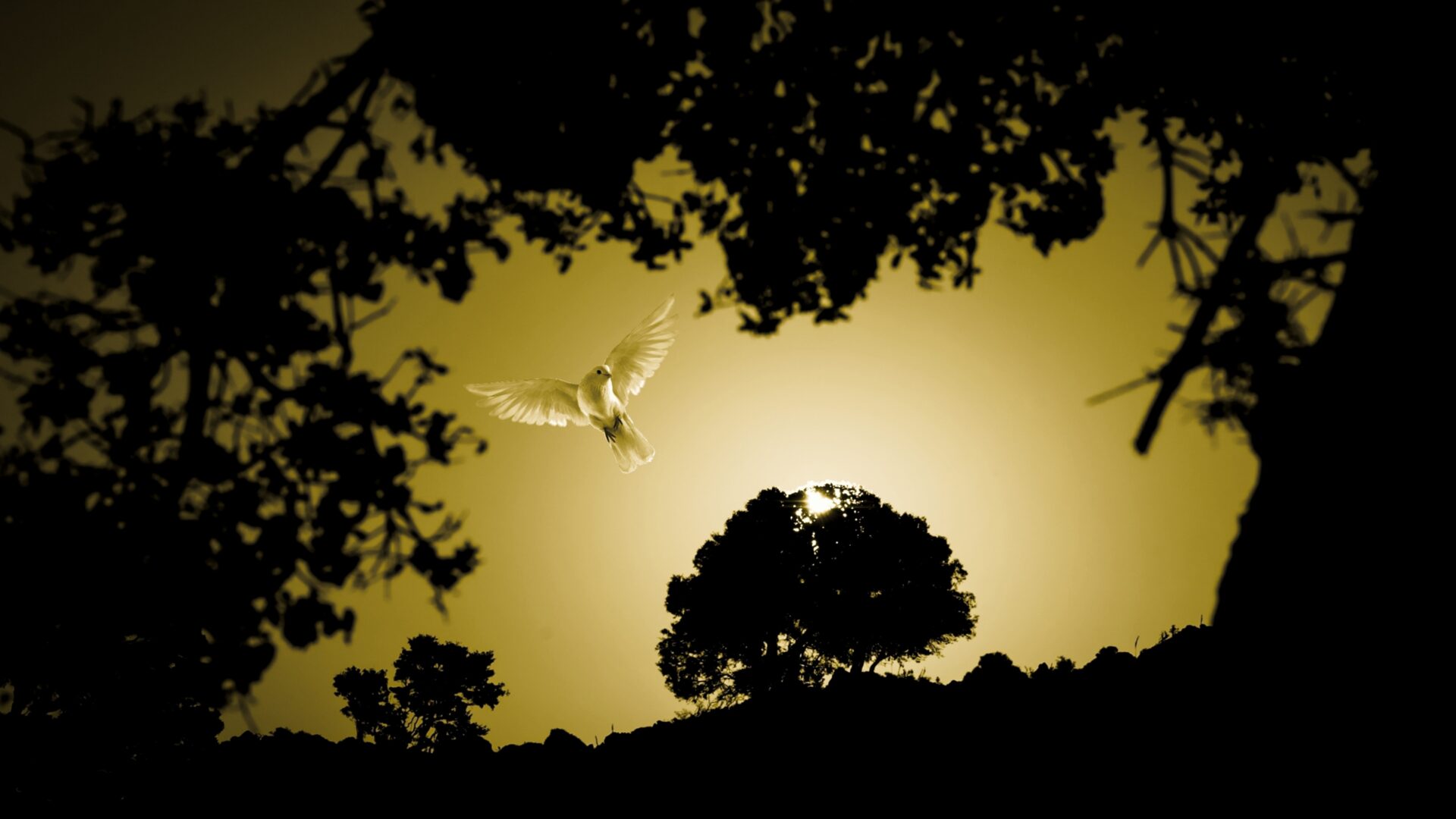 A bird flies silhouetted against a bright, golden sky. Dark branches frame the scene, creating a vignette effect and emphasizing the central light source.