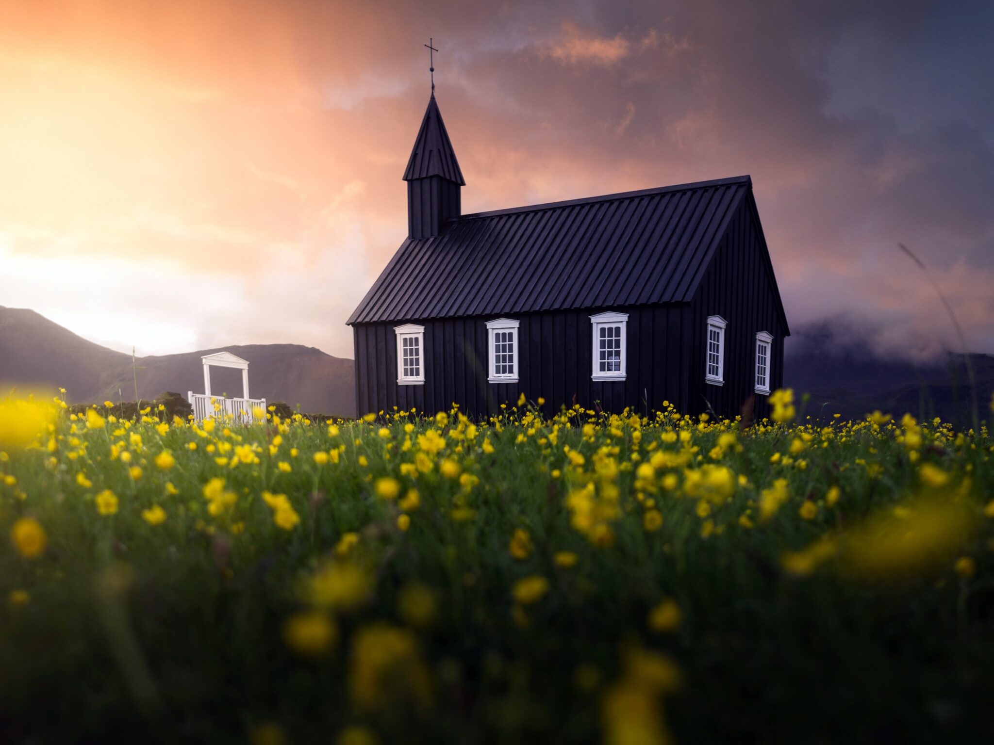 A small black church stands within a field of bright yellow wildflowers, backed by distant mountains. Soft, warm light highlights the textur…