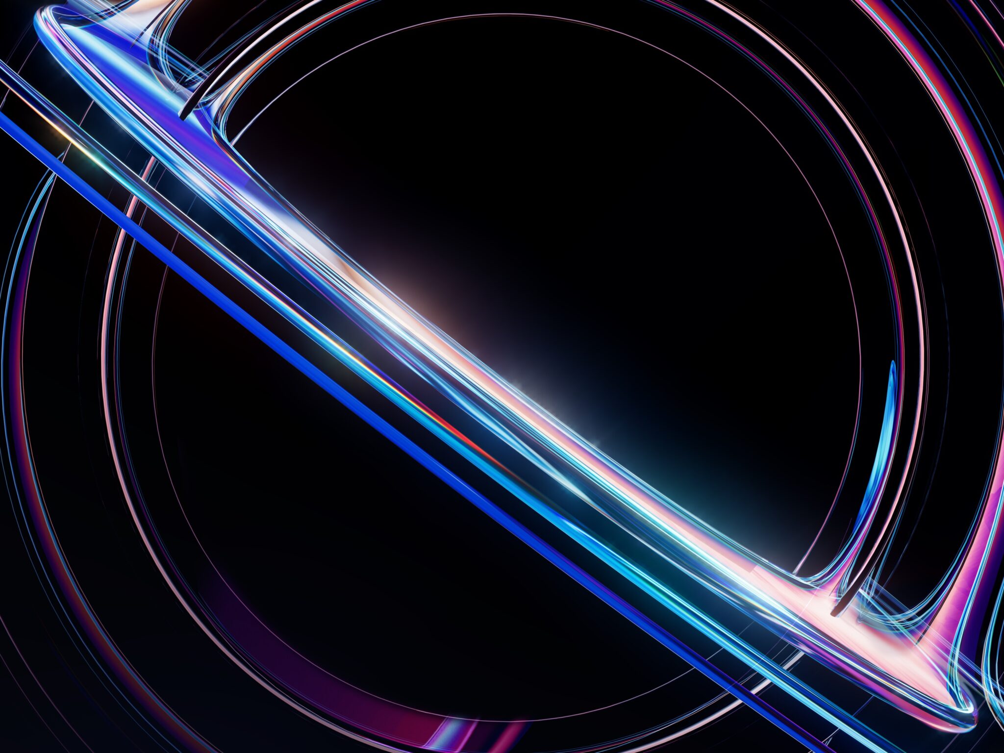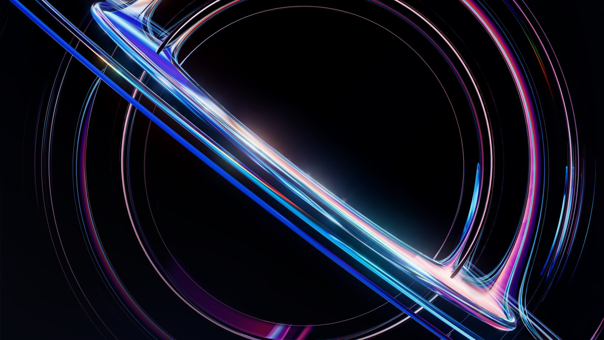 Swirling streams of electric blue, magenta, and white light bend and twist around a dark void against a black background. Made for 4K monito…