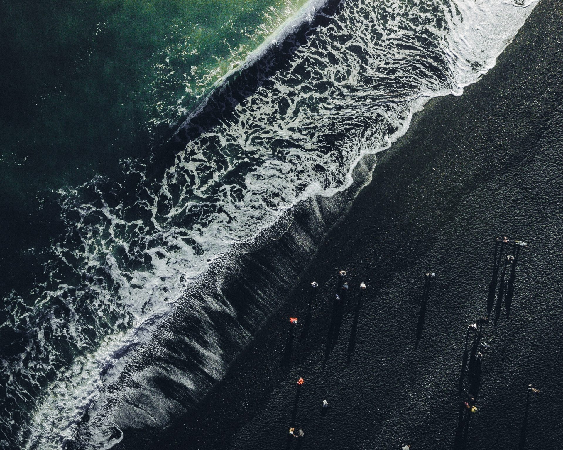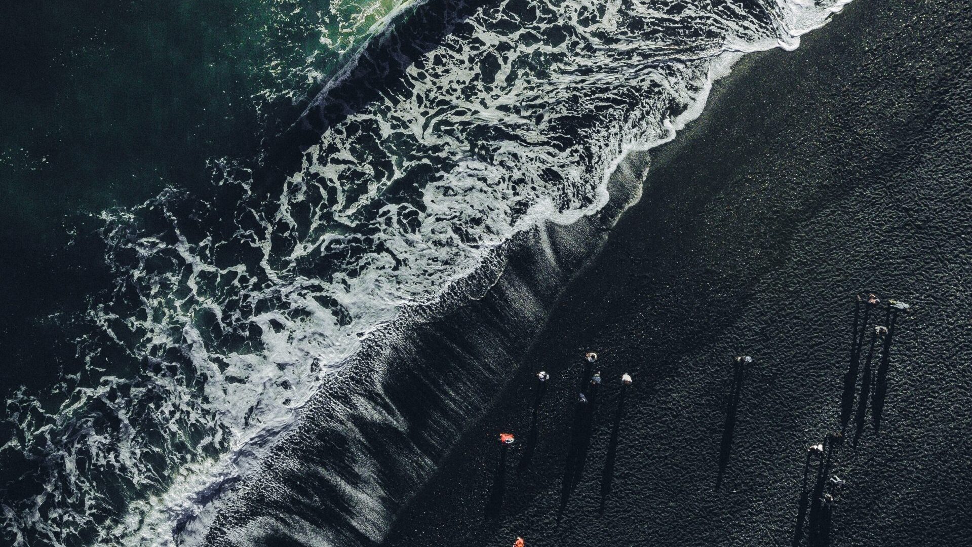 An aerial view depicts a crashing wave along a dark, sandy beach with scattered figures. Long shadows stretch across the gray sand, contrast…